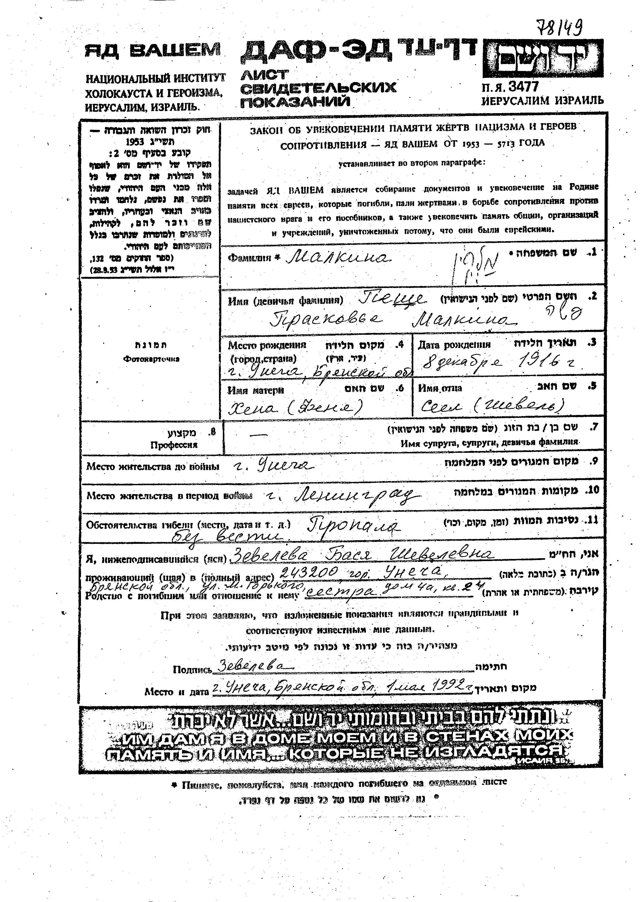 Malkin Peshe Praskovya 1916 Unecha, Russland (UdSSR) Gedenkblatt