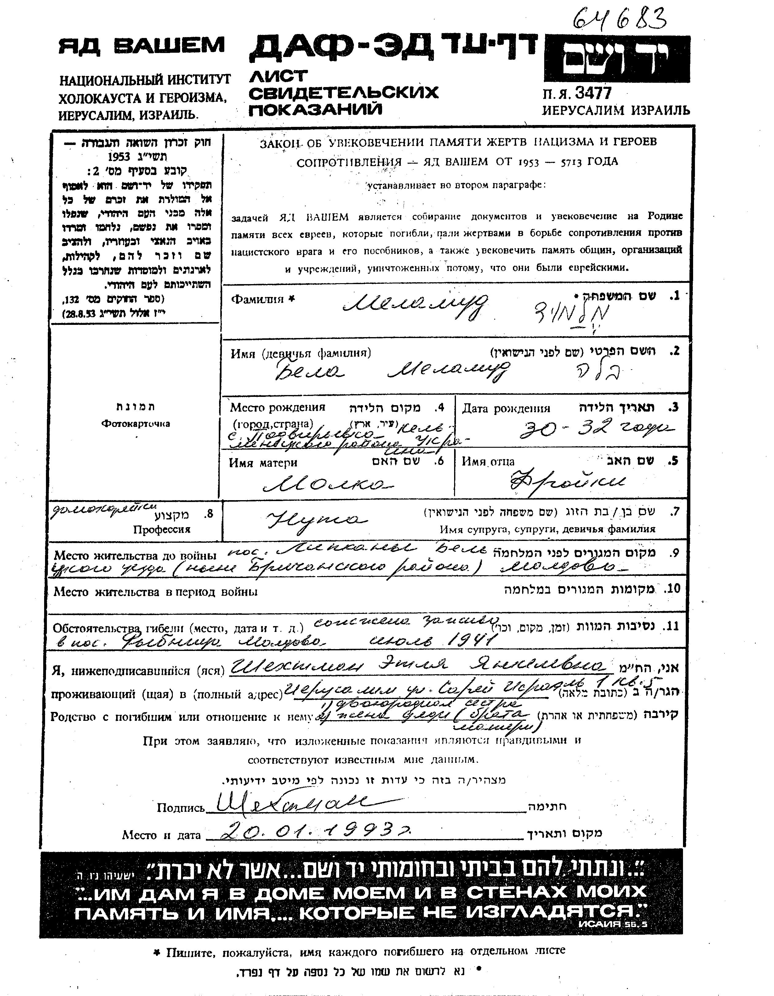 Bela Melamud, geb. Malmood wurde in Podvornoye, Rumänien geboren. Sie war die Tochter von Froiki und Molka. Sie war Hausfrau und mit Nuta Verheiratet. Vor dem Zweiten Weltkrieg lebte sie in Lipcani, Rumänien. Während des Krieges war sie in Rybnitsa, Ukraine (UdSSR).