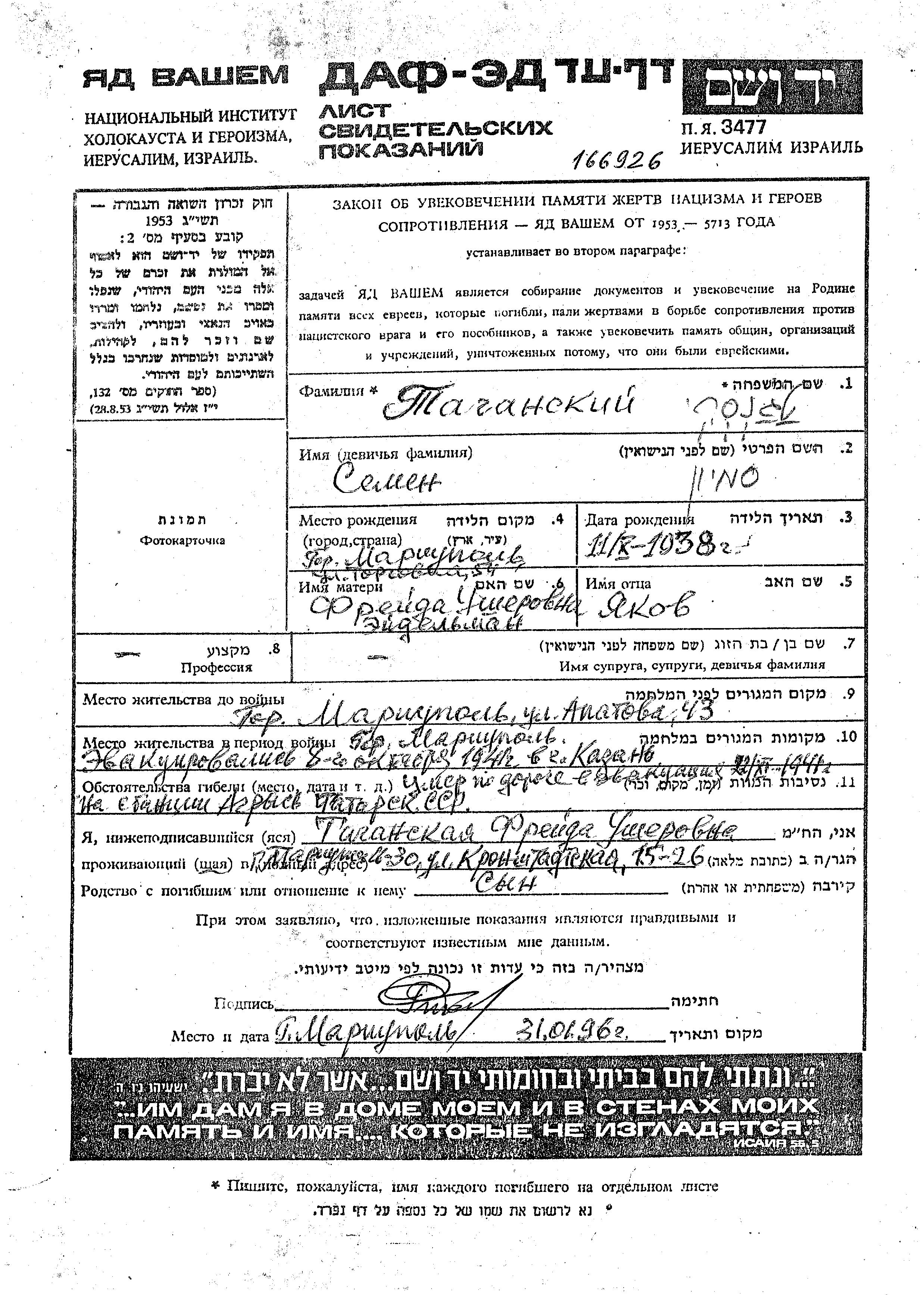 Semion Taganski wurde im Jahr 1938 in Mariupol, Ukraine (UdSSR) geboren. Er war der Sohn von Yakov und Freida, geb. Eidelman. Er war Kind. Vor dem Zweiten Weltkrieg lebte er in Mariupol, Ukraine (UdSSR). Während des Krieges war er in Mariupol, Ukraine (UdSSR).