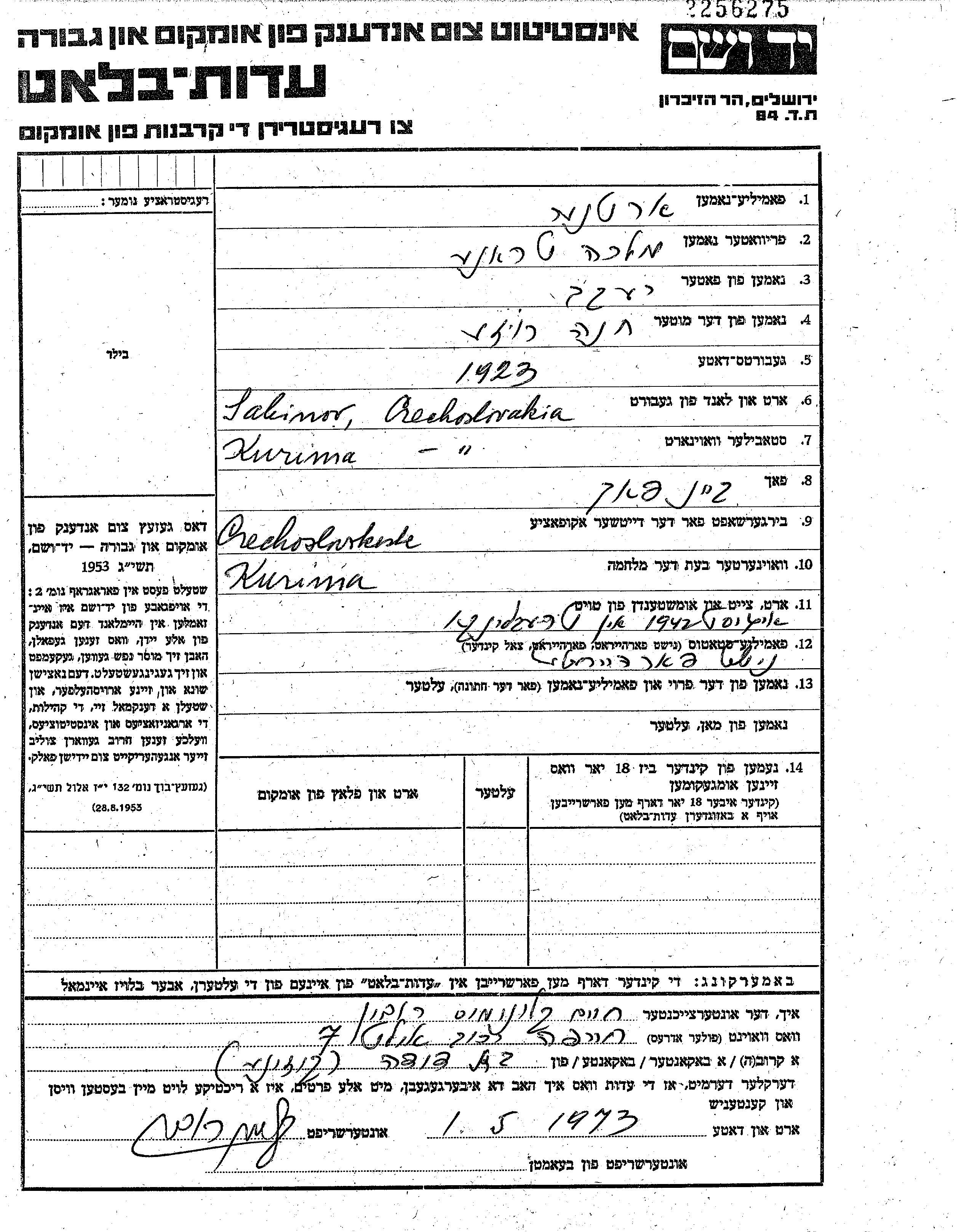 Artner Treine Malka 1923 Kurima, Tschechoslowakei Gedenkblatt