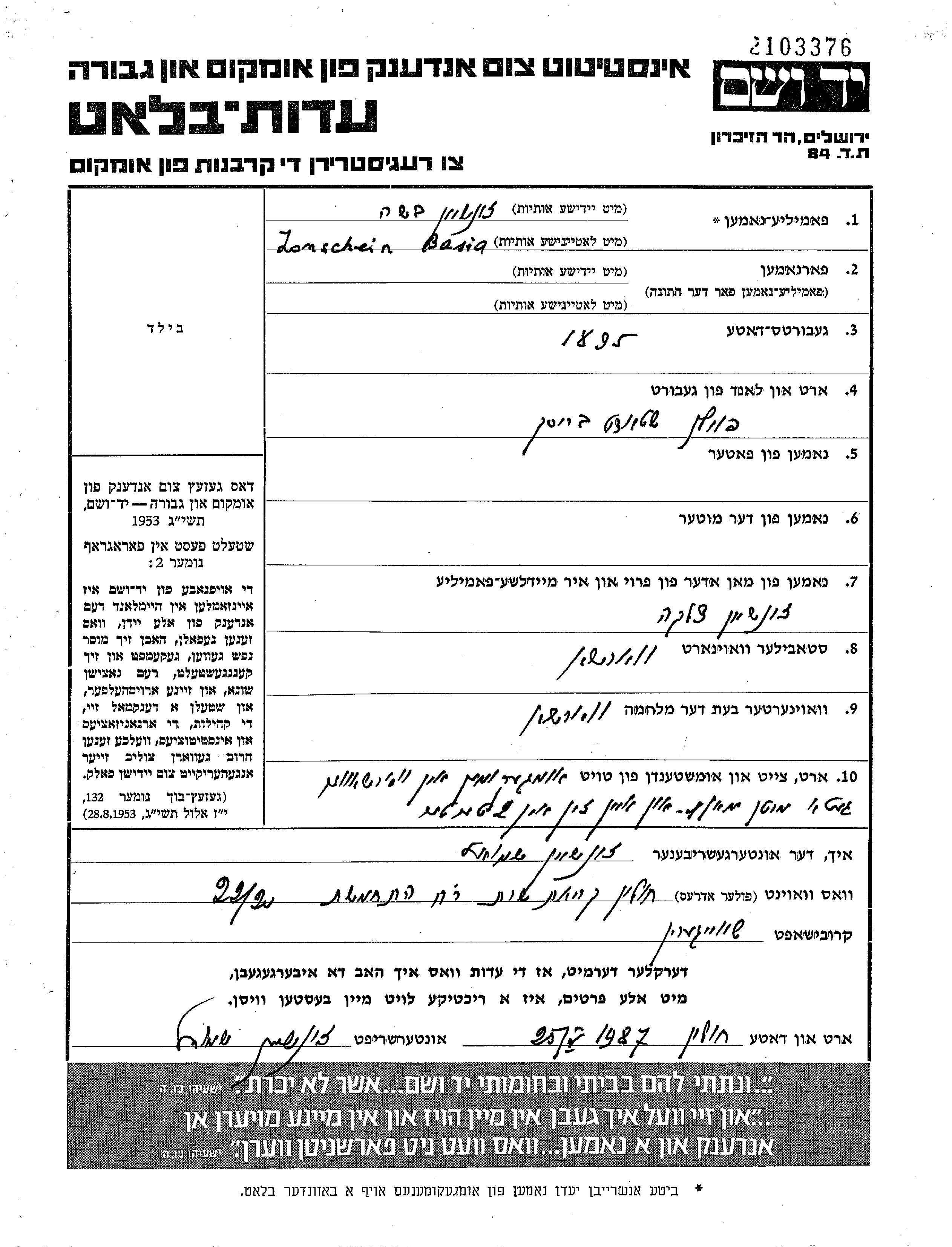 Basia Zonschein wurde in Brześć nad Bugiem, Polen geboren. Sie war mit Calke Tzila Verheiratet. Vor dem Zweiten Weltkrieg lebte sie in Warszawa, Polen. Während des Krieges war sie in Warszawa, Polen.