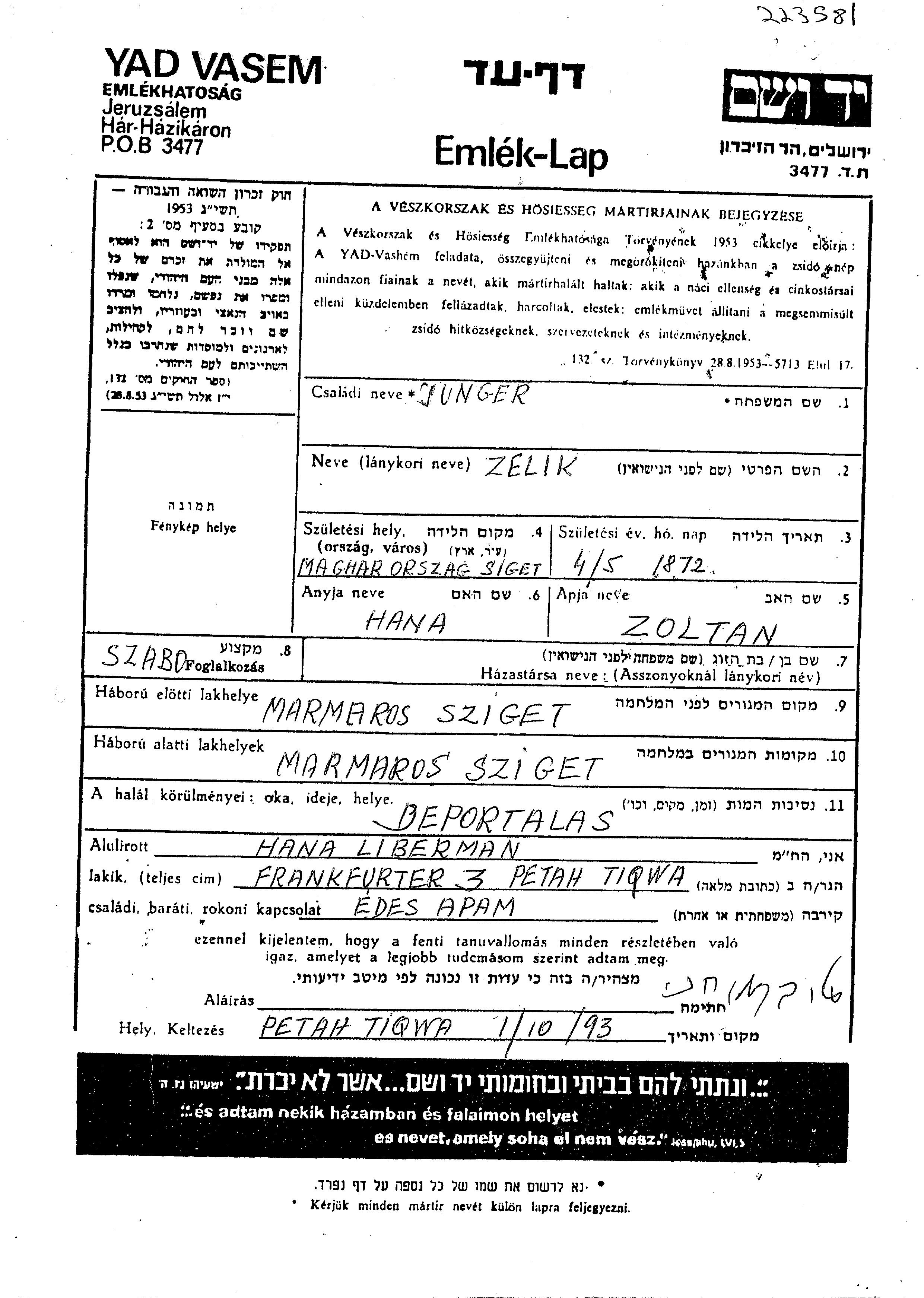 Zelig Junger wurde im Jahr 1872 in Sighet, Rumänien geboren. Er war der Sohn von Zoltan und Hana. Er war Schneider und mit Reghina Verheiratet. Vor dem Zweiten Weltkrieg lebte er in Maramarossziget, Rumänien. Während des Krieges war er in Maramarossziget, Rumänien.