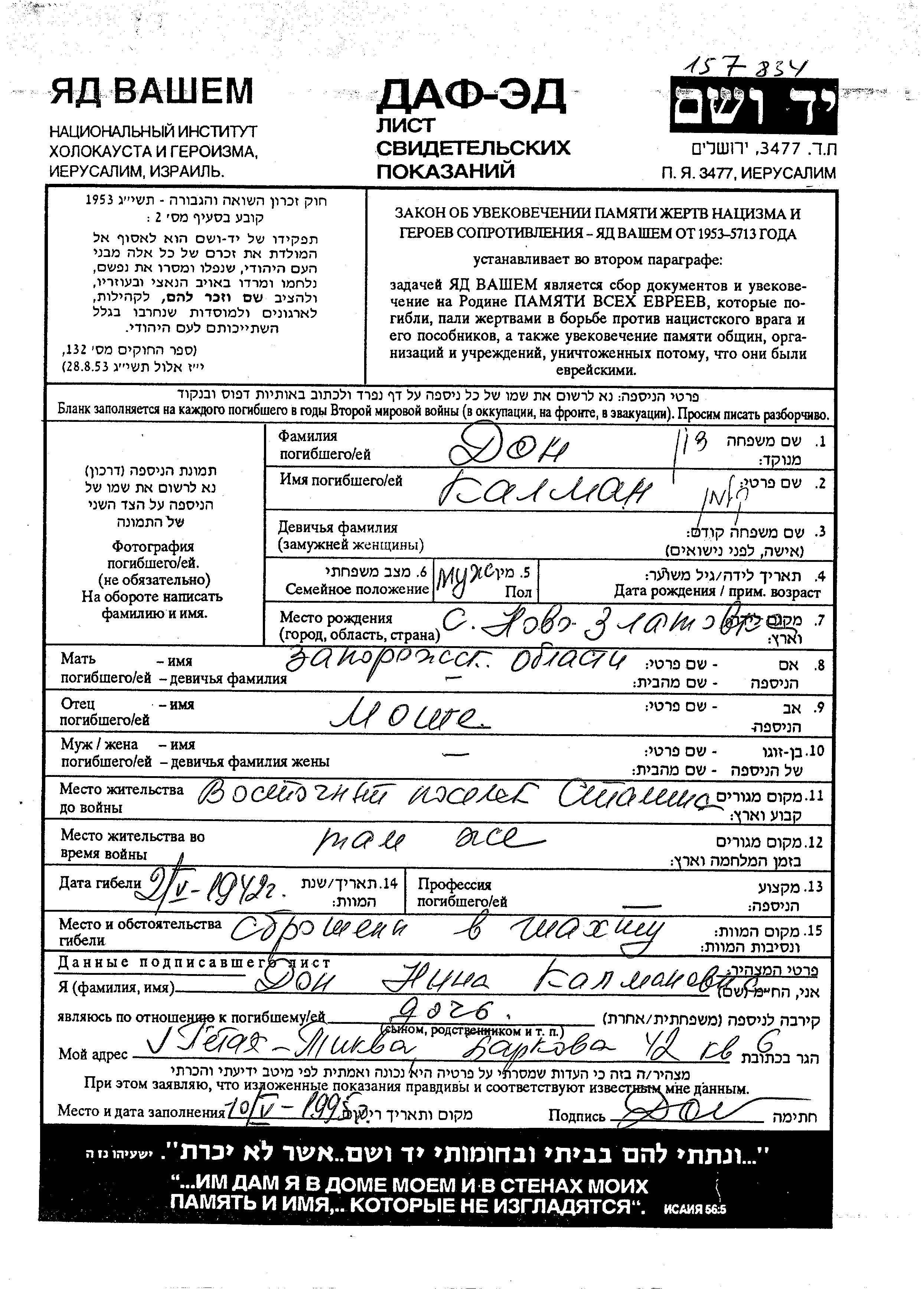 Kalman wurde in der Schoah ermordet. Todesort: Stalino, Ukraine (UdSSR) im Jahr 02/05/1942.