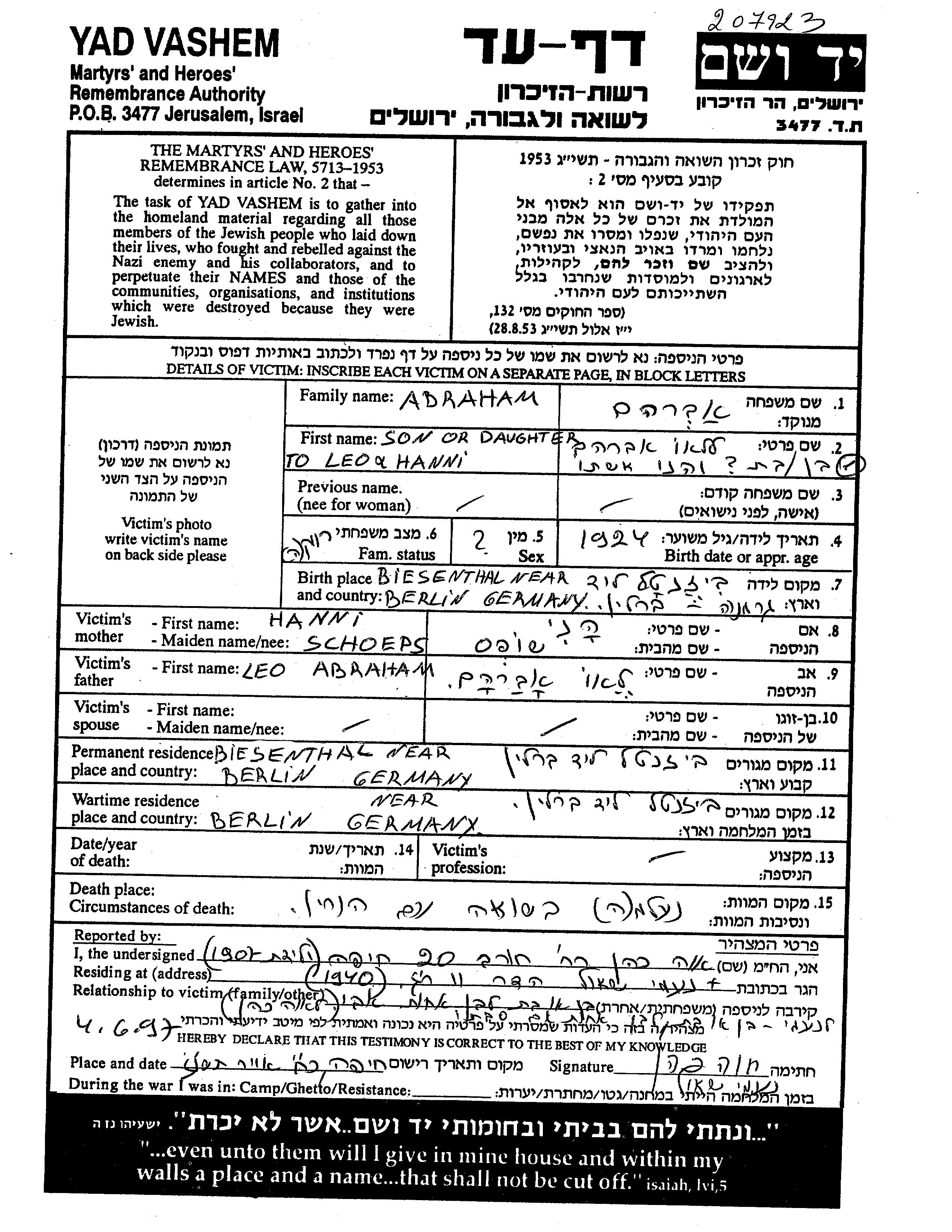 Vorname unbekannt Abraham wurde im Jahr 1924 in Biesenthal, Deutsches Reich geboren. Er war der Sohn von Leo und Hanni Yohana, geb. Schoeps. Er war Ledig. Vor dem Zweiten Weltkrieg lebte er in Biesenthal, Deutsches Reich. Während des Krieges war er in Biesenthal, Deutsches Reich.