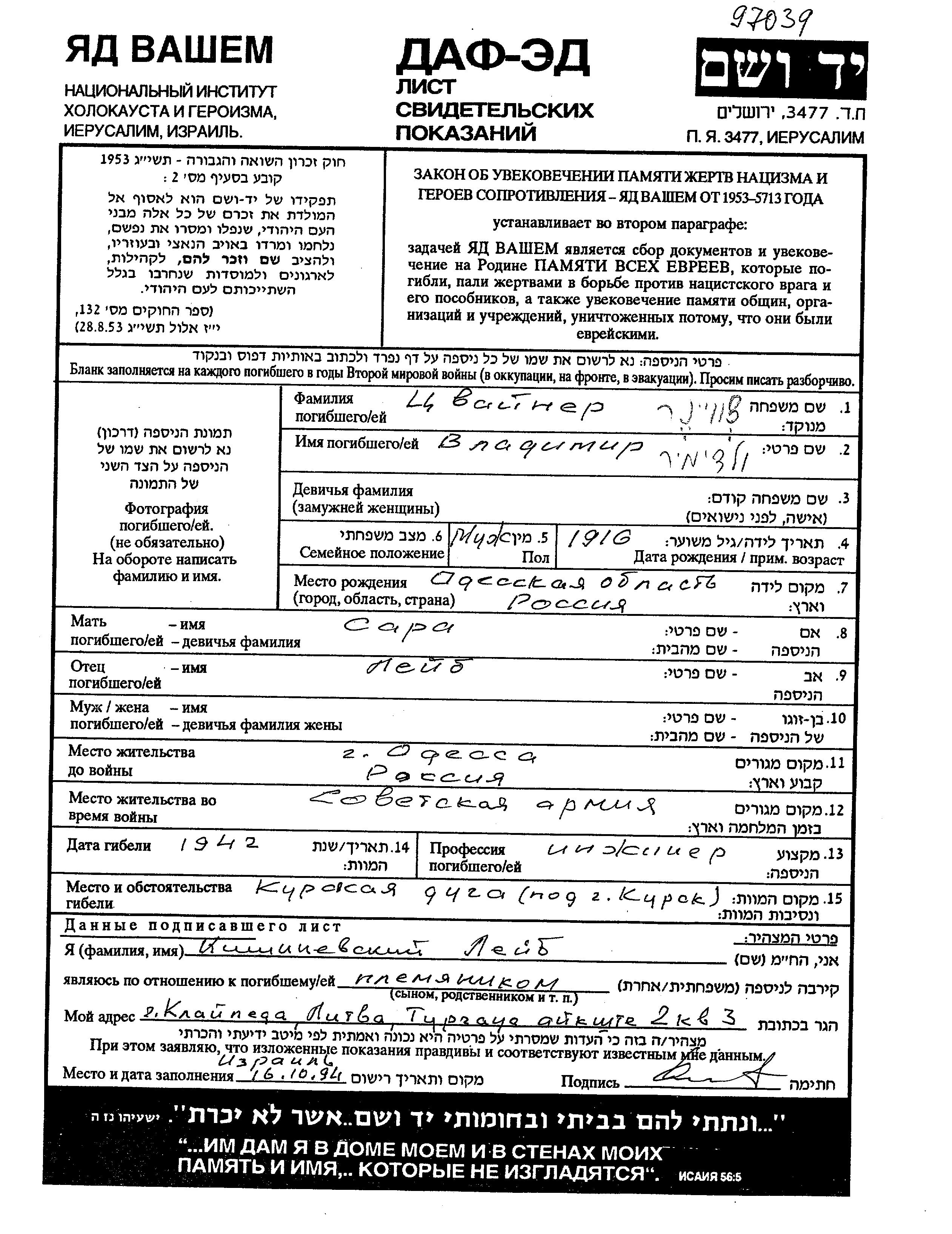 Vladimir Tzvainer wurde im Jahr 1916 in Odessa, Ukraine (UdSSR) geboren. Er war der Sohn von Leib und Sara. Er war Ingenieur. Vor dem Zweiten Weltkrieg lebte er in Odessa, Ukraine (UdSSR). Während des Krieges war er in die Sowjetischen Streitkräfte. Vladimir im Militärdienst umgekommen. Todesort: Kursk, Russland (UdSSR) im Jahr 1943.