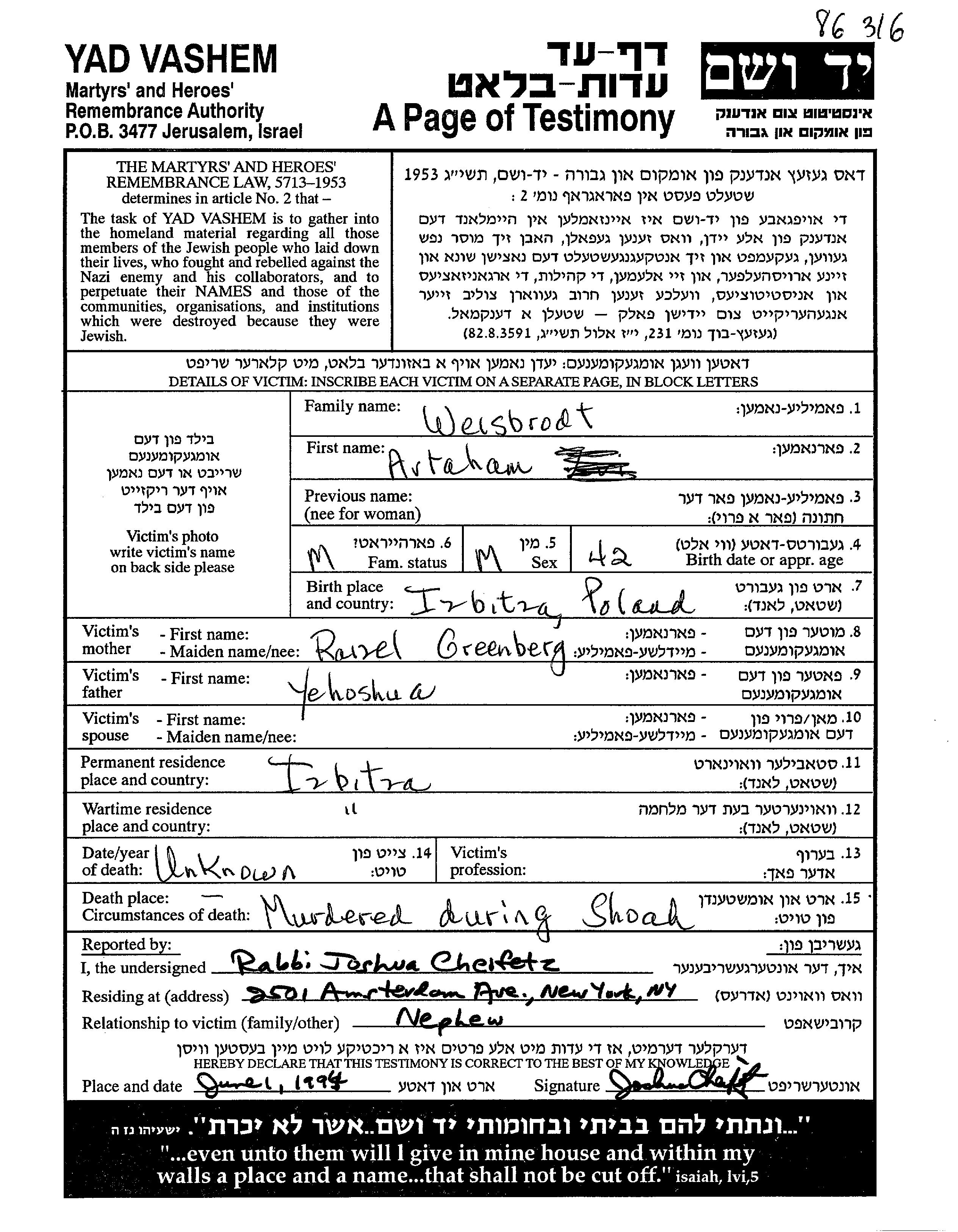 Avraham Weisbrodt wurde in Izbica, Polen geboren. Er war der Sohn von Yehoshua und Raizel, geb. Greenberg. Er war Verheiratet. Vor dem Zweiten Weltkrieg lebte er in Izbica, Polen. Während des Krieges war er in Izbica, Polen.
