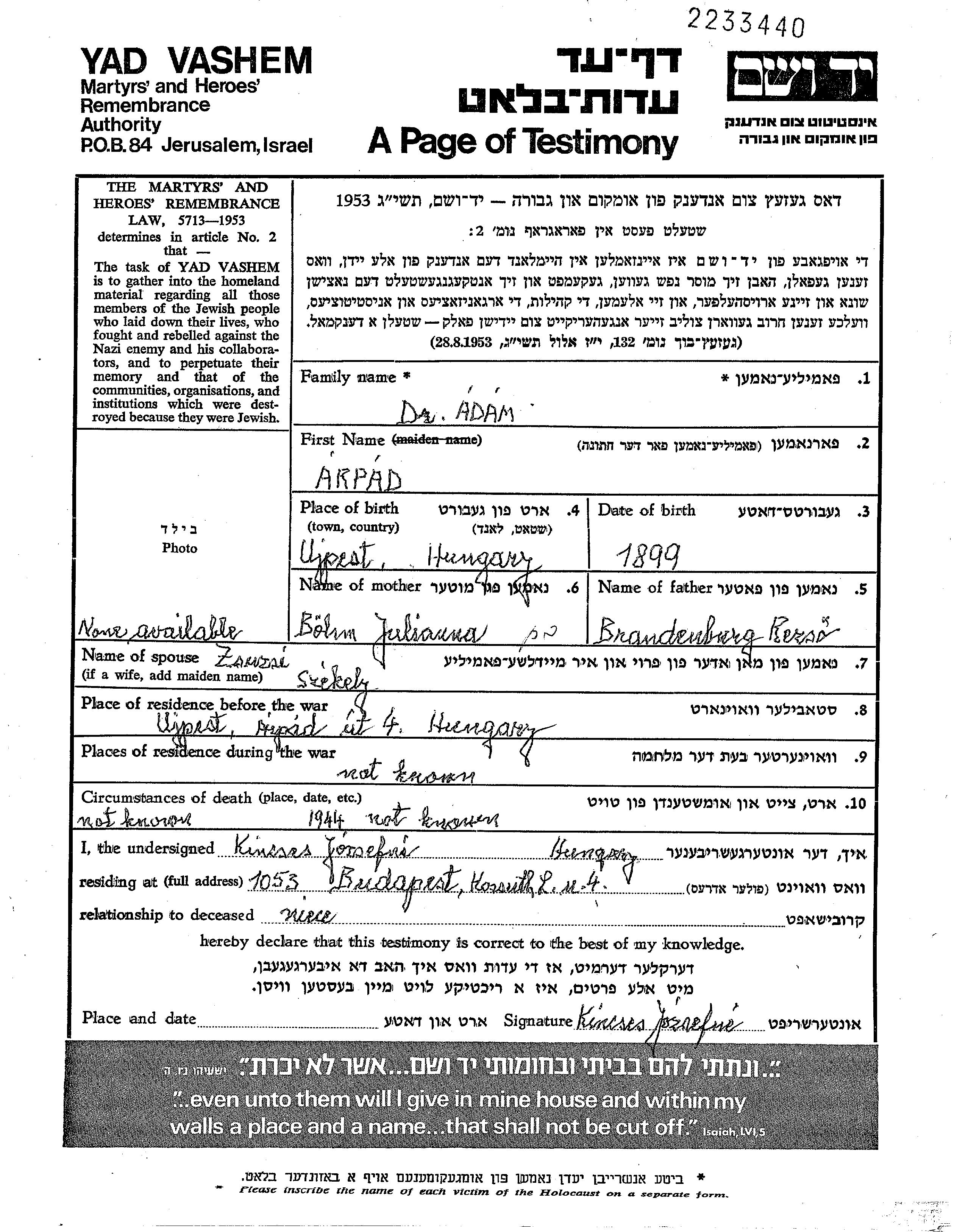 Dr. Arpad Adam wurde im Jahr 1899 in Ujpest, Ungarn geboren. Er war der Sohn von Rezso und Julianna, geb. Böhm. Er war mit Zsuzsi Verheiratet. Vor dem Zweiten Weltkrieg lebte er in Ujpest, Ungarn.