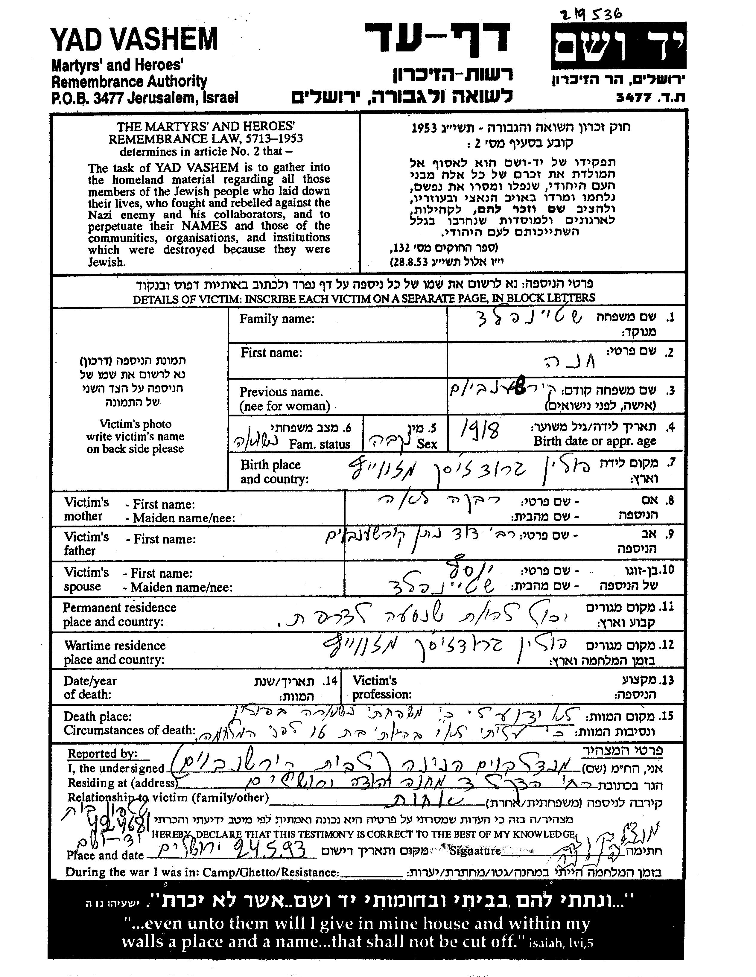 Khana Shteinfeld, geb. Kirshenboim wurde im Jahr 1918 in Grodzisk Mazowiecki, Polen geboren. Sie war die Tochter von David Natan und Rivka, geb. Yakubovich. Sie war mit Josef Verheiratet. Vor dem Zweiten Weltkrieg lebte sie in Grodzisk Mazowiecki, Polen. Während des Krieges war sie in Grodzisk Mazowiecki, Polen.
