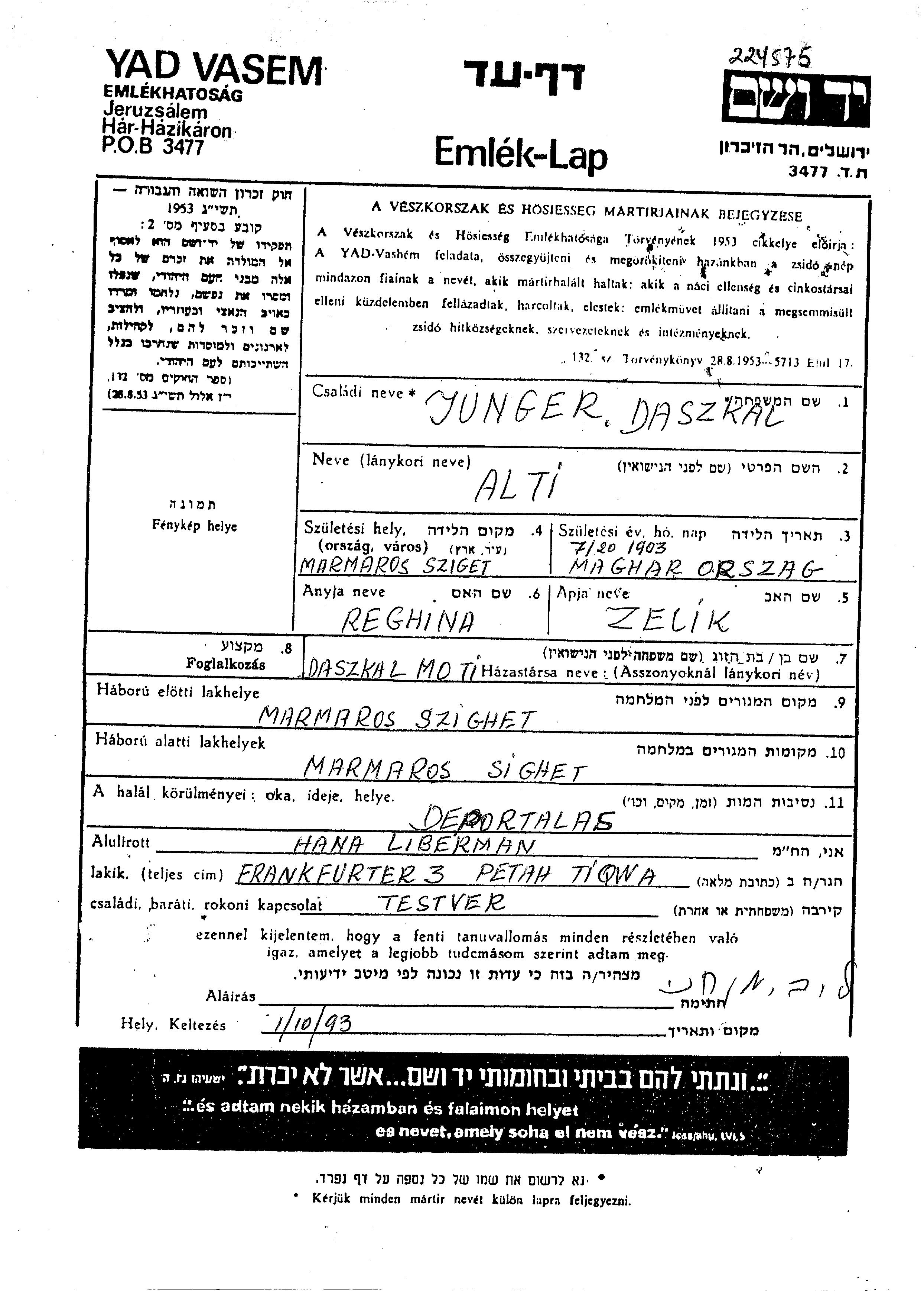 Alti Junger Daszkal, geb. Junger wurde im Jahr 1903 in Maramarossziget, Rumänien geboren. Sie war die Tochter von Zelig und Reghina. Sie war mit Moti Verheiratet. Vor dem Zweiten Weltkrieg lebte sie in Maramarossziget, Rumänien. Während des Krieges war sie in Maramarossziget, Rumänien.
