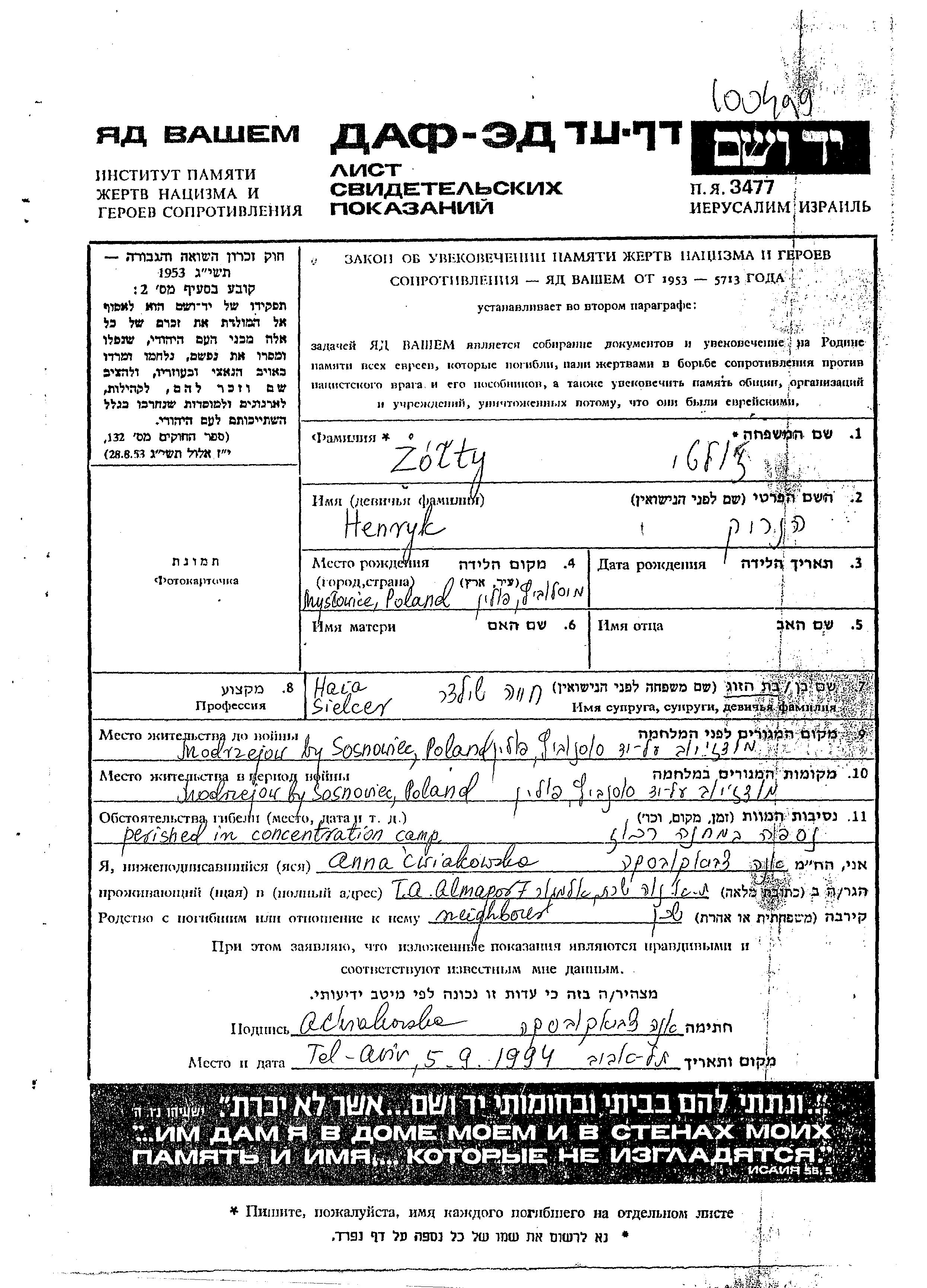Henryk Zolty wurde in Myslowice, Polen geboren. Er war mit Haia, geb. Sielcer Verheiratet. Vor dem Zweiten Weltkrieg lebte er in Modrzejow, Polen. Während des Krieges war er in Modrzejow, Polen.