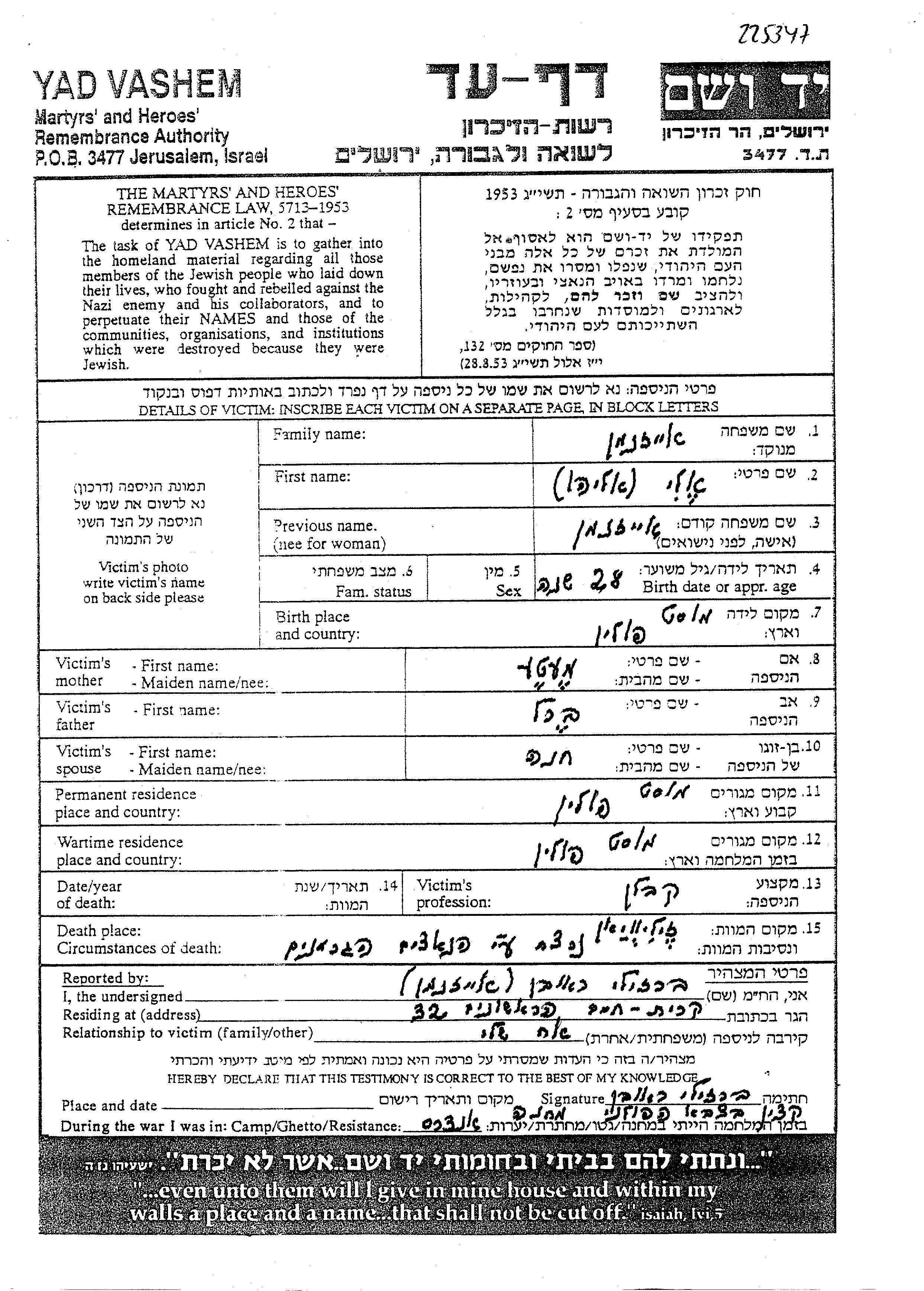 Eli Eliyahu wurde in der Schoah ermordet. Todesort: Mosty, Polen.