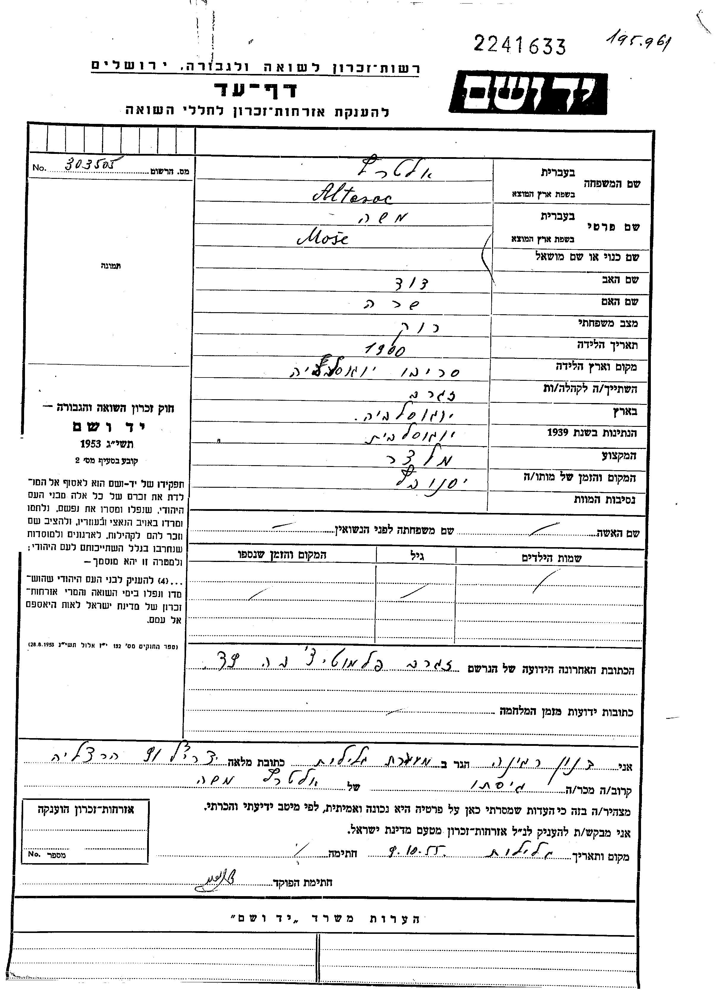 Mose Altarac wurde im Jahr 1900 in Sarajevo, Jugoslawien geboren. Er war der Sohn von David und Sara. Er war Kellner/in und Ledig. Vor dem Zweiten Weltkrieg lebte er in Zagreb, Jugoslawien. Während des Krieges war er in Jugoslawien.