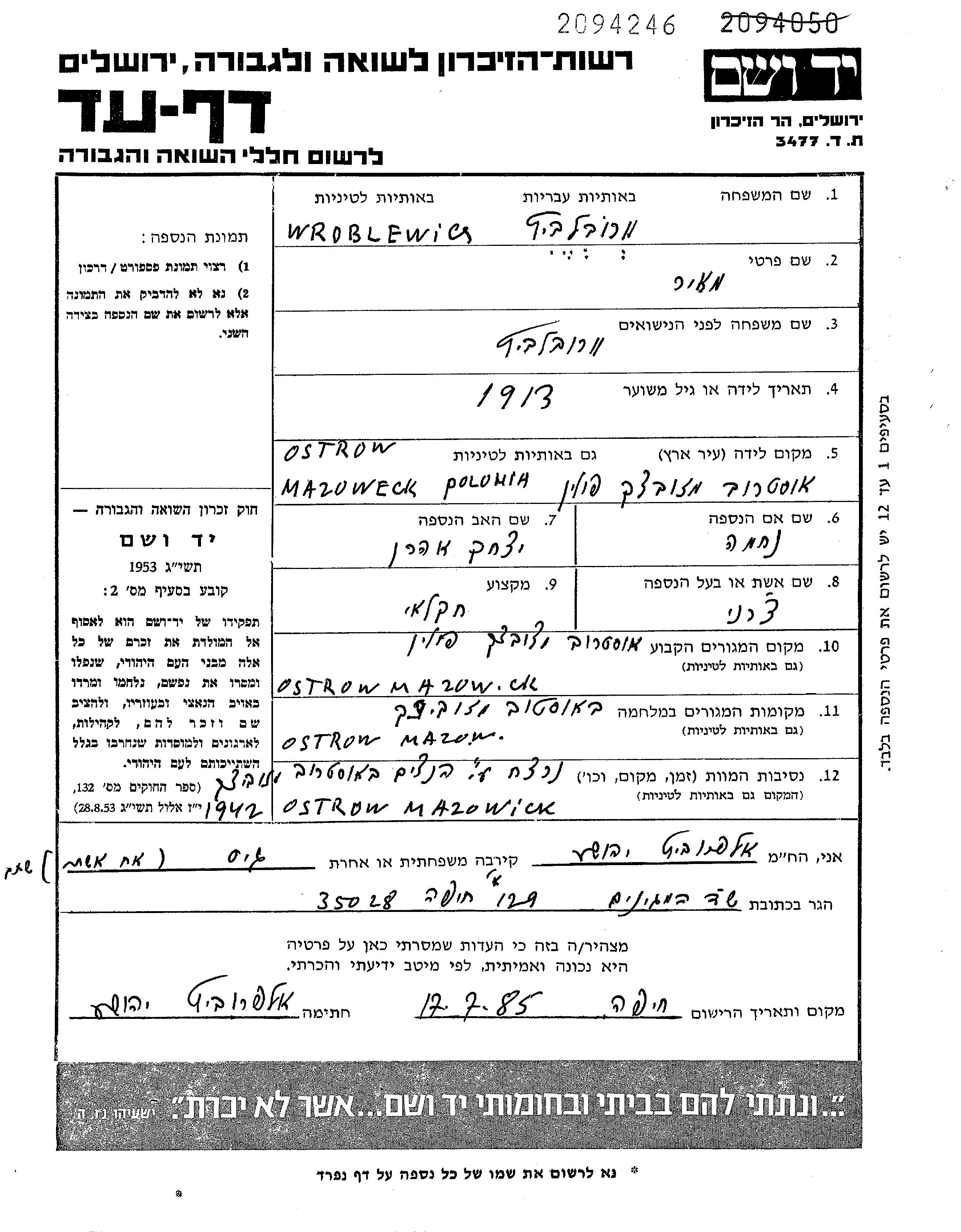 Meir Wroblewics wurde in Ostrów Mazowiecka, Polen geboren. Er war der Sohn von Ytzkhak Aharon und Nekhama. Er war Landwirt und mit Charna Verheiratet. Vor dem Zweiten Weltkrieg lebte er in Ostrów Mazowiecka, Polen. Während des Krieges war er in Ostrów Mazowiecka, Polen.