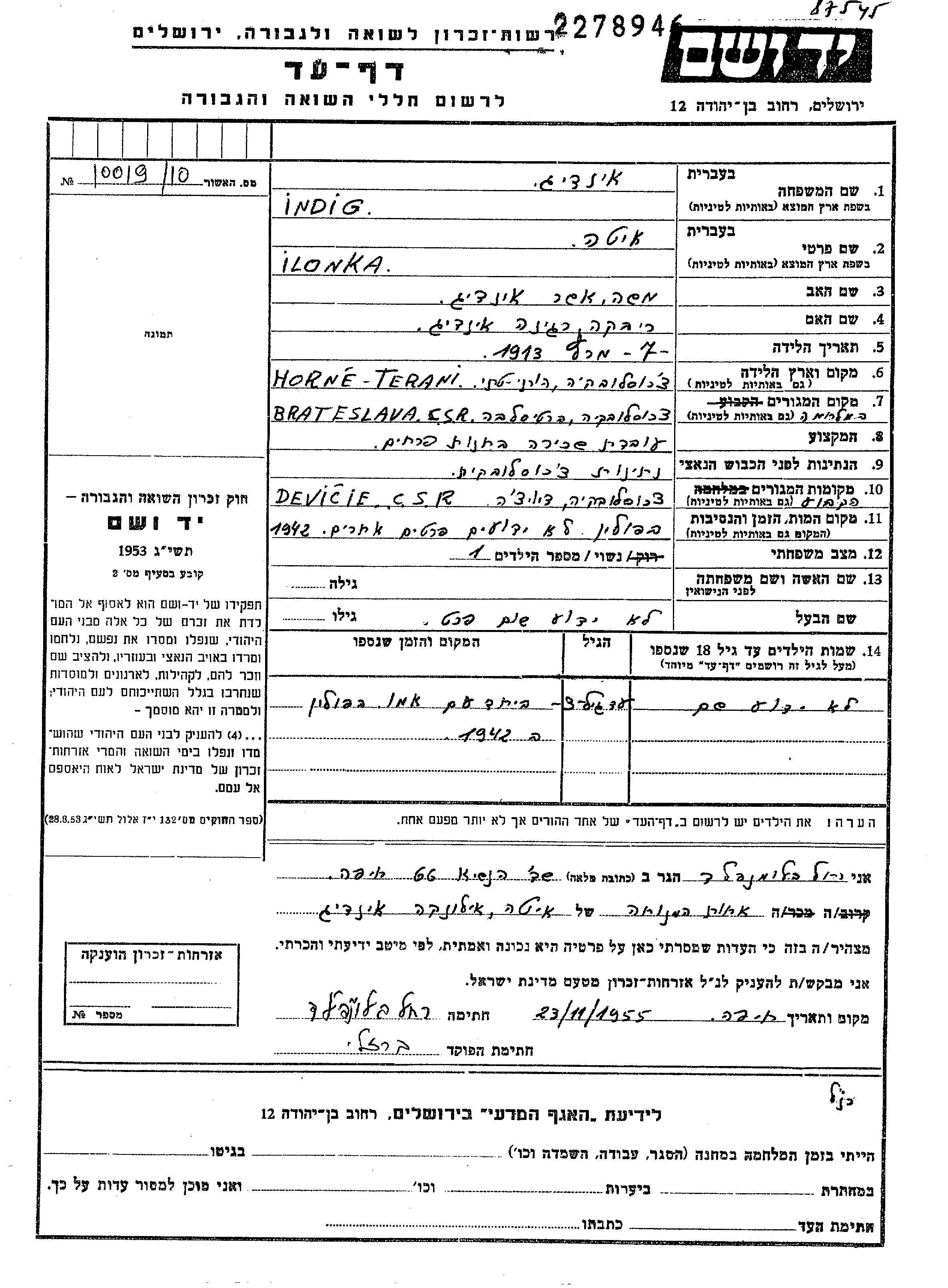 Ilonka Ita Indig, geb. Indig wurde im Jahr 1913 in Horny Taran, Tschechoslowakei geboren. Sie war die Tochter von Geza Moshe Asher und Rivka Regina, geb. Kahan. Sie war Verkäufer/-in und Verheiratet. Vor dem Zweiten Weltkrieg lebte sie in Devicie, Tschechoslowakei. Während des Krieges war sie in Bratislava, Tschechoslowakei.