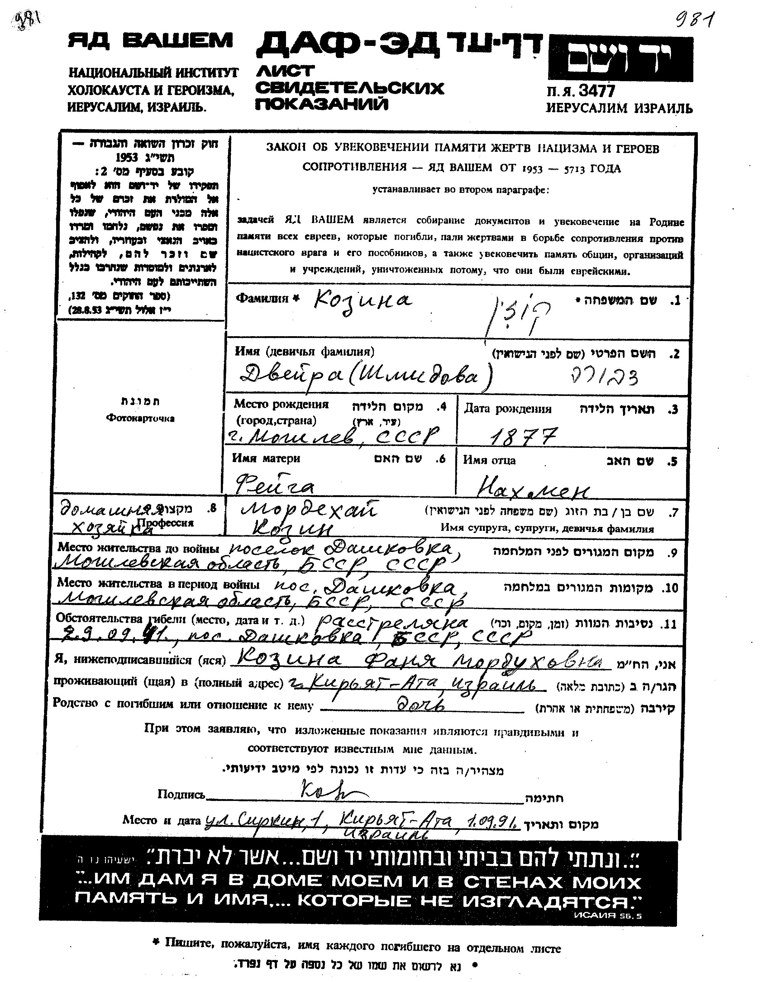 Dveira Kozin Kuzin, geb. Shmidova wurde im Jahr 1877 in Mogilev, Weißrussland (UdSSR) geboren. Sie war die Tochter von Nakhmen und Feiga. Sie war Hausfrau und mit Mordekhai Verheiratet. Vor dem Zweiten Weltkrieg lebte sie in Dashkovka, Weißrussland (UdSSR). Während des Krieges war sie in Dashkovka, Weißrussland (UdSSR).