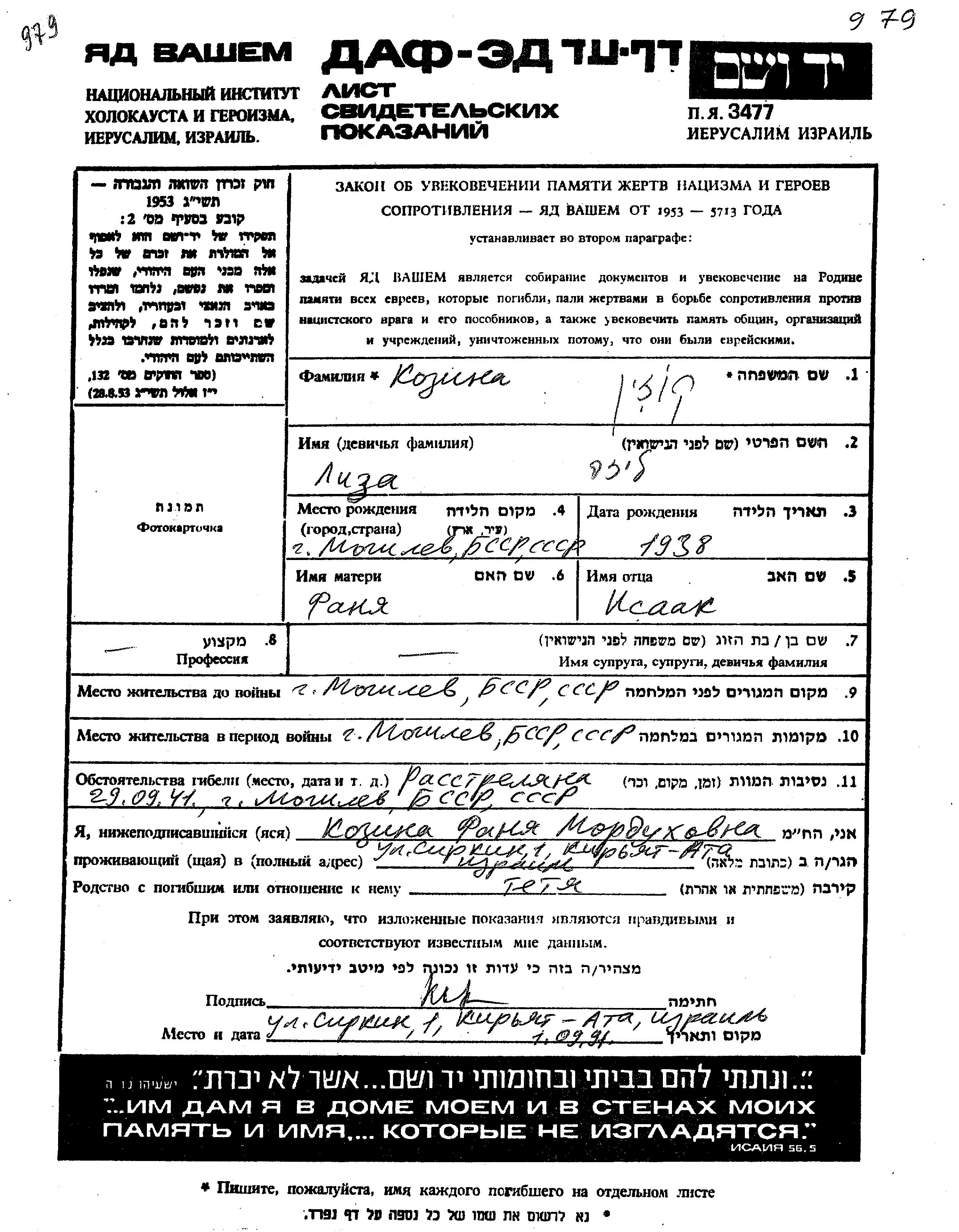 Liza Kozin Kuzin wurde im Jahr 1938 in Mogilev, Weißrussland (UdSSR) geboren. Sie war die Tochter von Isaak und Fania. Sie war Kind. Vor dem Zweiten Weltkrieg lebte sie in Mogilev, Weißrussland (UdSSR). Während des Krieges war sie in Mogilev, Weißrussland (UdSSR).