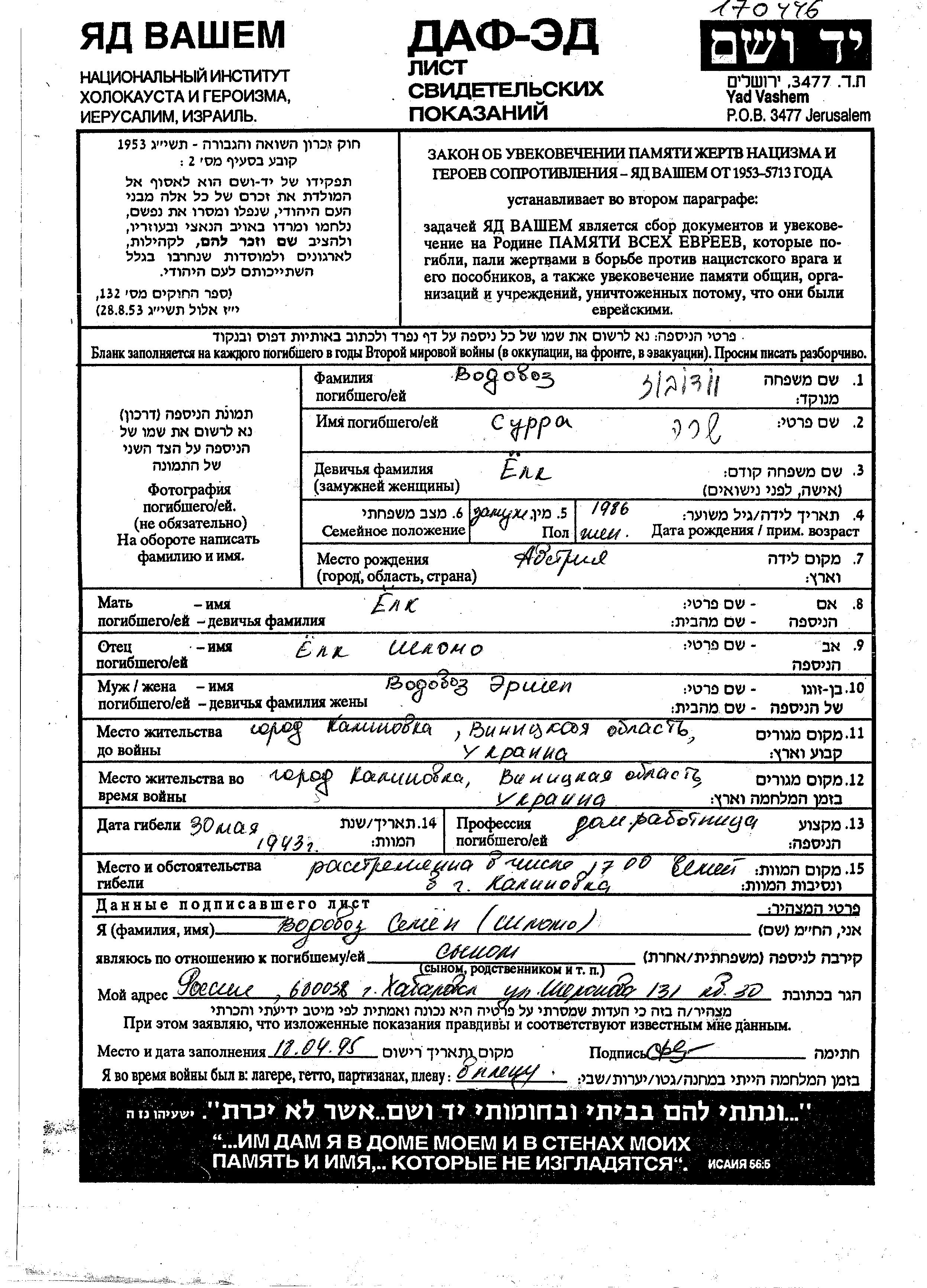 Sura Vodovoz, geb. Yolk wurde im Jahr 1886 geboren. Sie war die Tochter von Shlomo. Sie war Hausangestellte und mit Ershel Verheiratet. Vor dem Zweiten Weltkrieg lebte sie in Kalinovka, Ukraine (UdSSR). Während des Krieges war sie in Kalinovka, Ukraine (UdSSR).