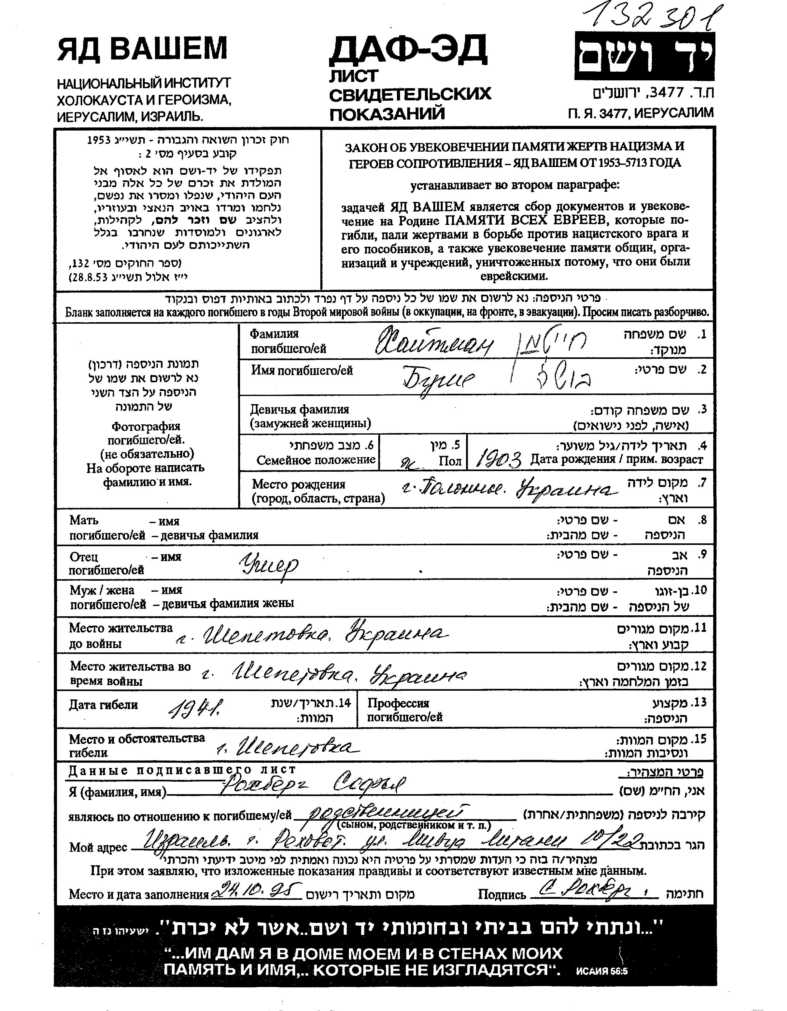 Bushe Khaitman wurde im Jahr 1903 in Polonnoye, Ukraine (UdSSR) geboren. Sie war die Tochter von Usher. Vor dem Zweiten Weltkrieg lebte sie in Shepetovka, Ukraine (UdSSR). Während des Krieges war sie in Shepetovka, Ukraine (UdSSR).