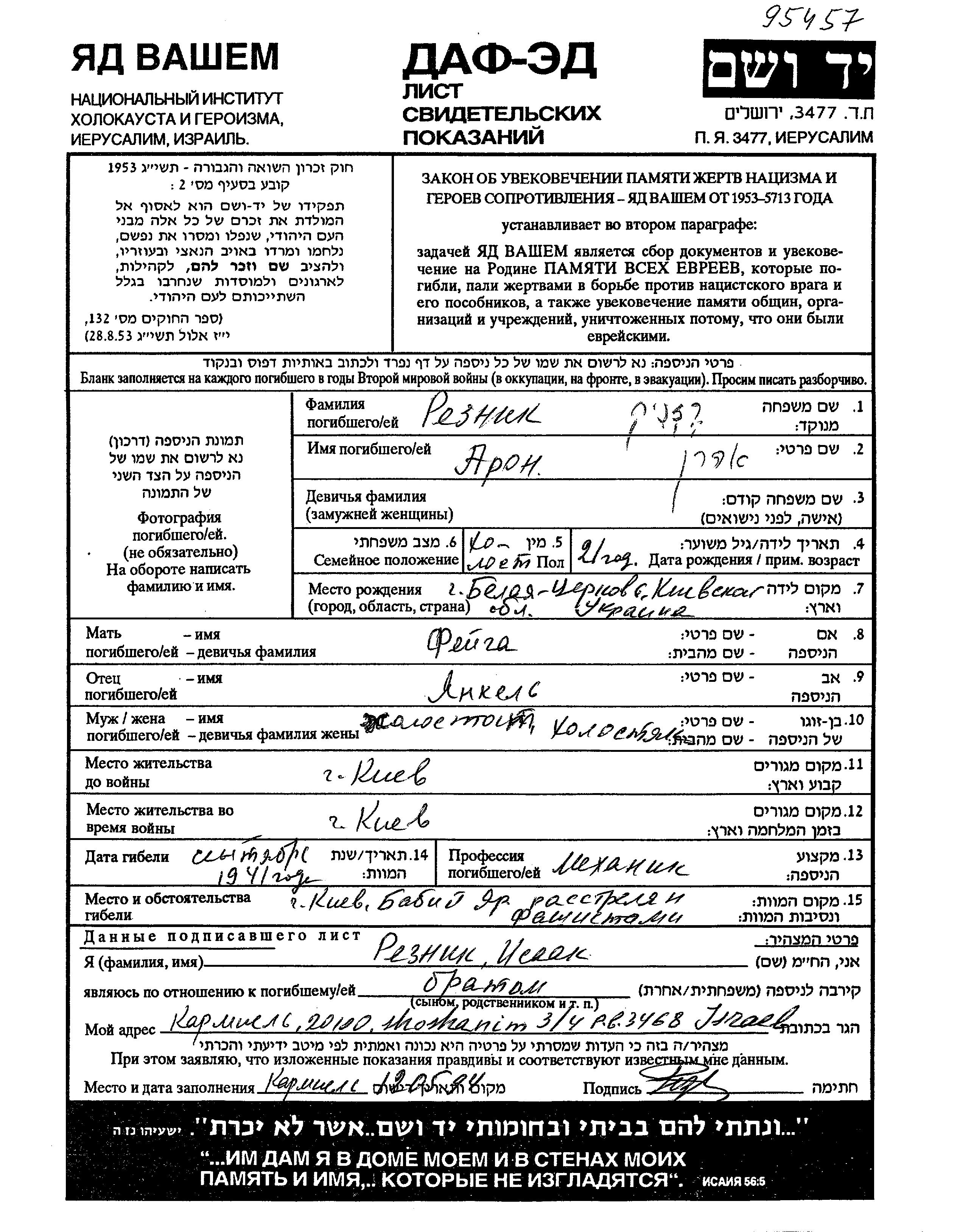 Aron Reznik wurde im Jahr 1920 in Belaya Tserkov, Ukraine (UdSSR) geboren. Er war der Sohn von Yankel und Feiga. Er war Mechaniker/-in und Ledig. Vor dem Zweiten Weltkrieg lebte er in Kiyev, Ukraine (UdSSR). Während des Krieges war er in Kiyev, Ukraine (UdSSR).