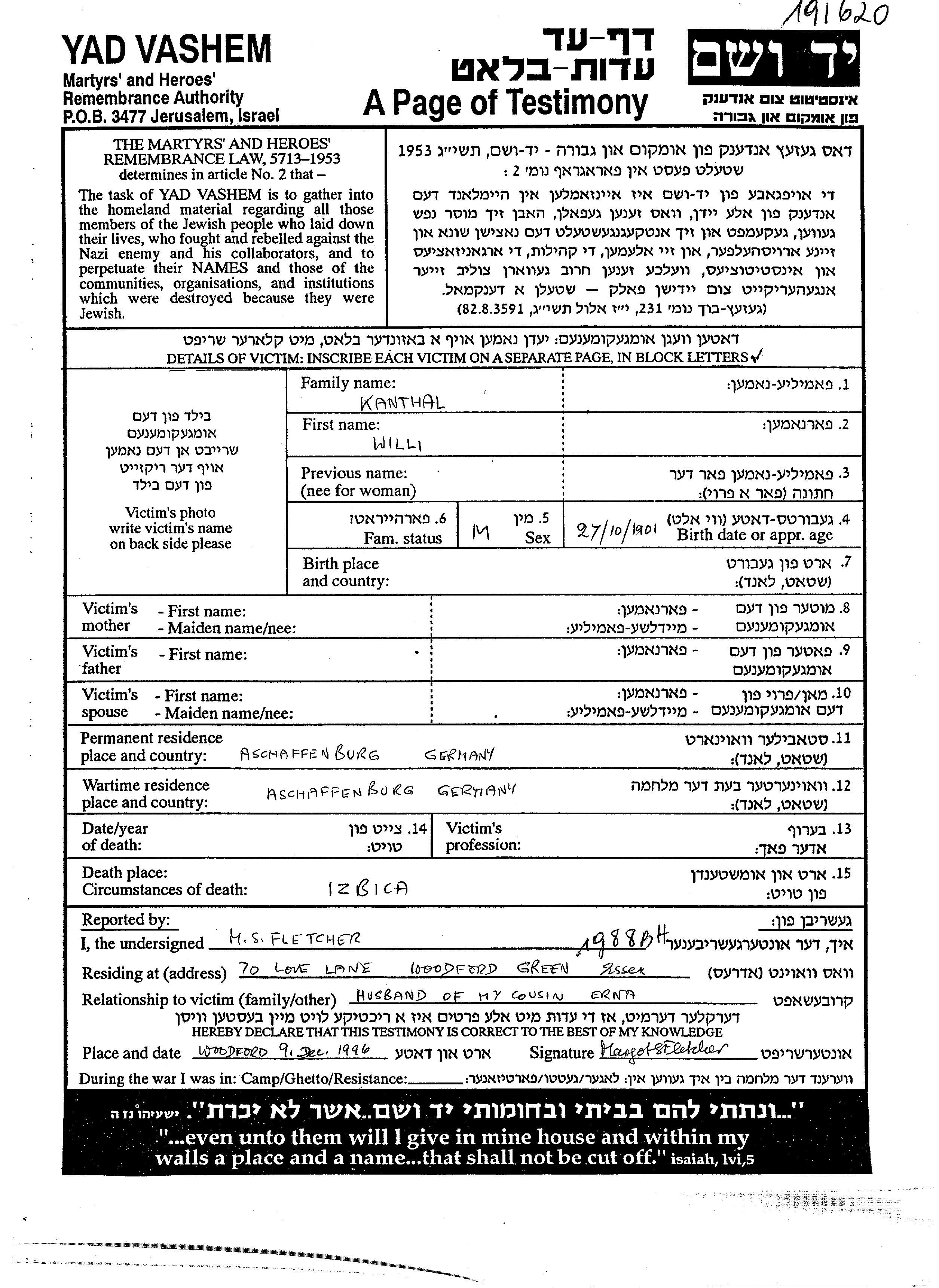 Willi Kanthal wurde im Jahr 1901 geboren. Er war mit Erna Verheiratet. Vor dem Zweiten Weltkrieg lebte er in Aschaffenburg, Deutsches Reich. Während des Krieges war er in Aschaffenburg, Deutsches Reich.