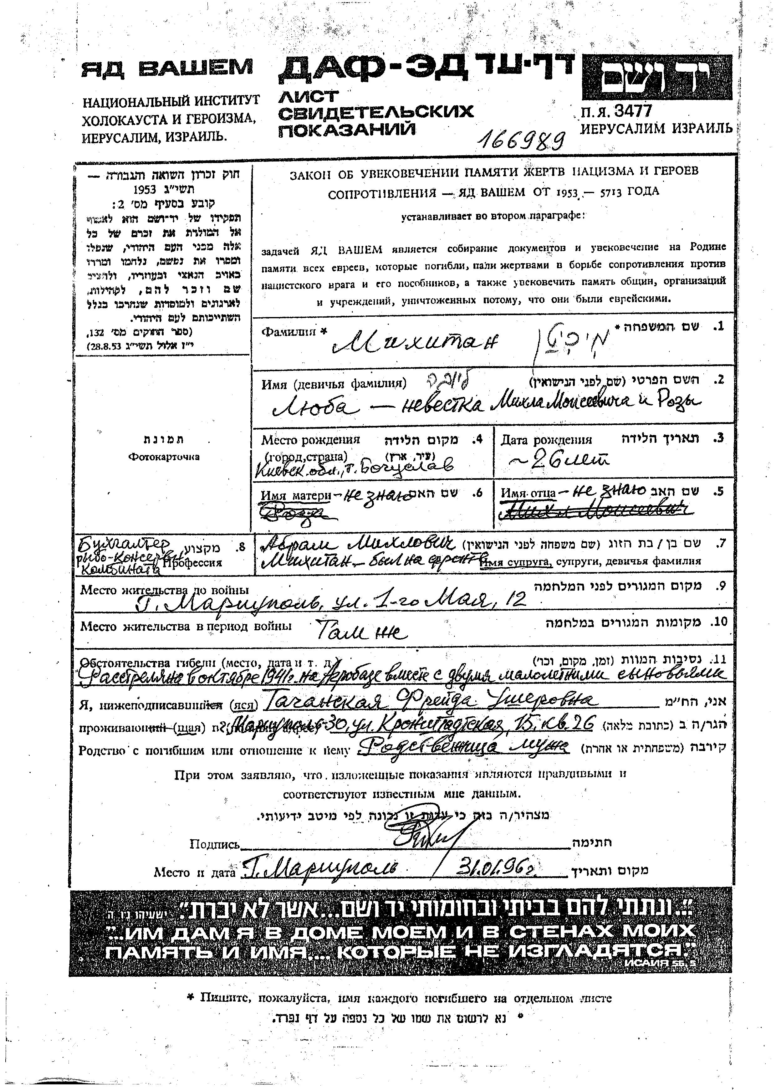 Lyuba Mikhitan wurde im Jahr 1915 in Boguslav, Ukraine (UdSSR) geboren. Sie war Buchhalter/-in und mit Abram Verheiratet. Vor dem Zweiten Weltkrieg lebte sie in Mariupol, Ukraine (UdSSR). Während des Krieges war sie in Mariupol, Ukraine (UdSSR).