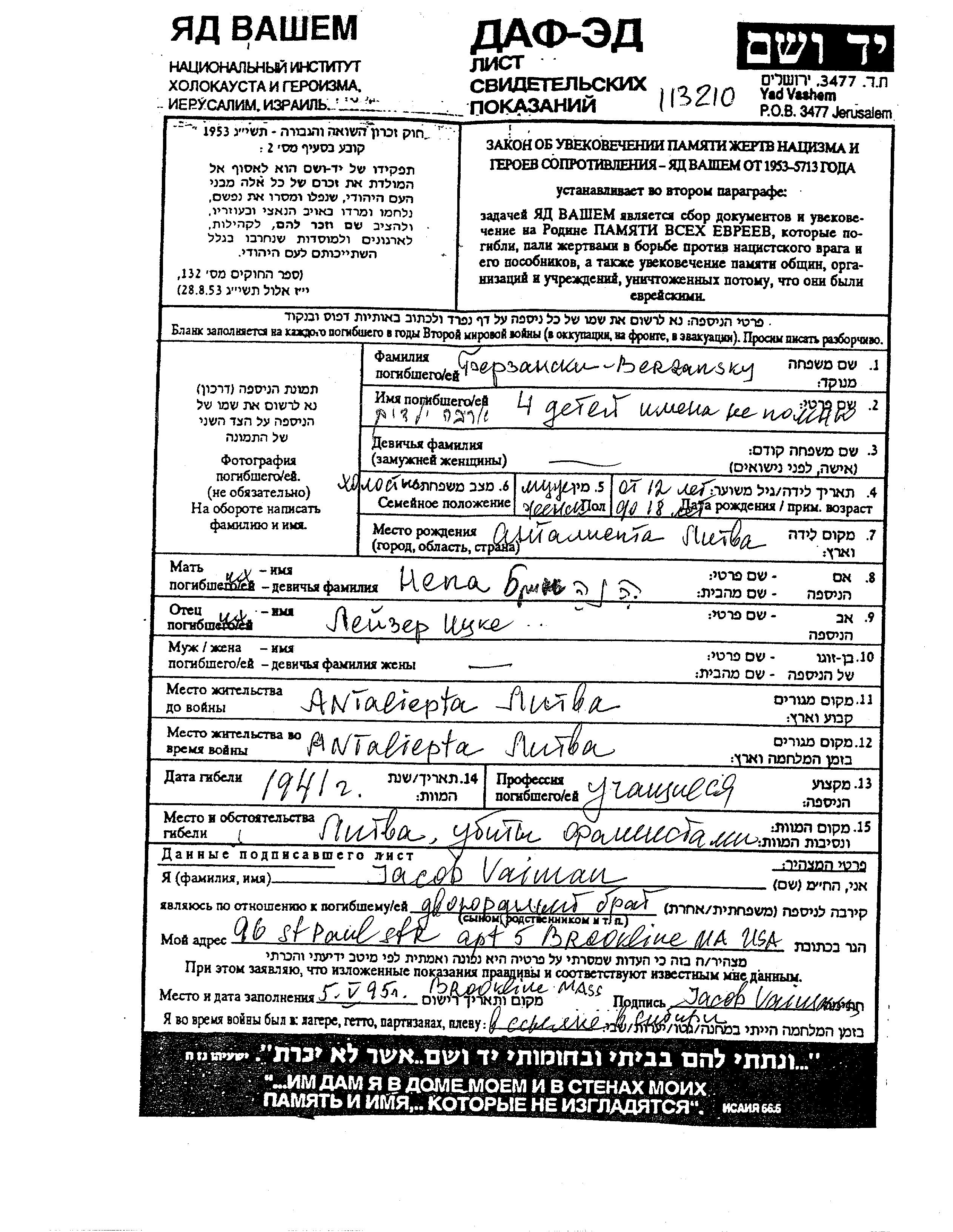 Vorname unbekannt Berzanski wurde in Antaliepte, Litauen geboren. Er/sie war der/ die Sohn/Tochter von Itzke Leizer und Khiena, geb. Brin. Er/Sie war Schüler/-in und Kind. Vor dem Zweiten Weltkrieg er/sie in Antaliepte, Litauen. Während des Krieges war er/sie in Antaliepte, Litauen.