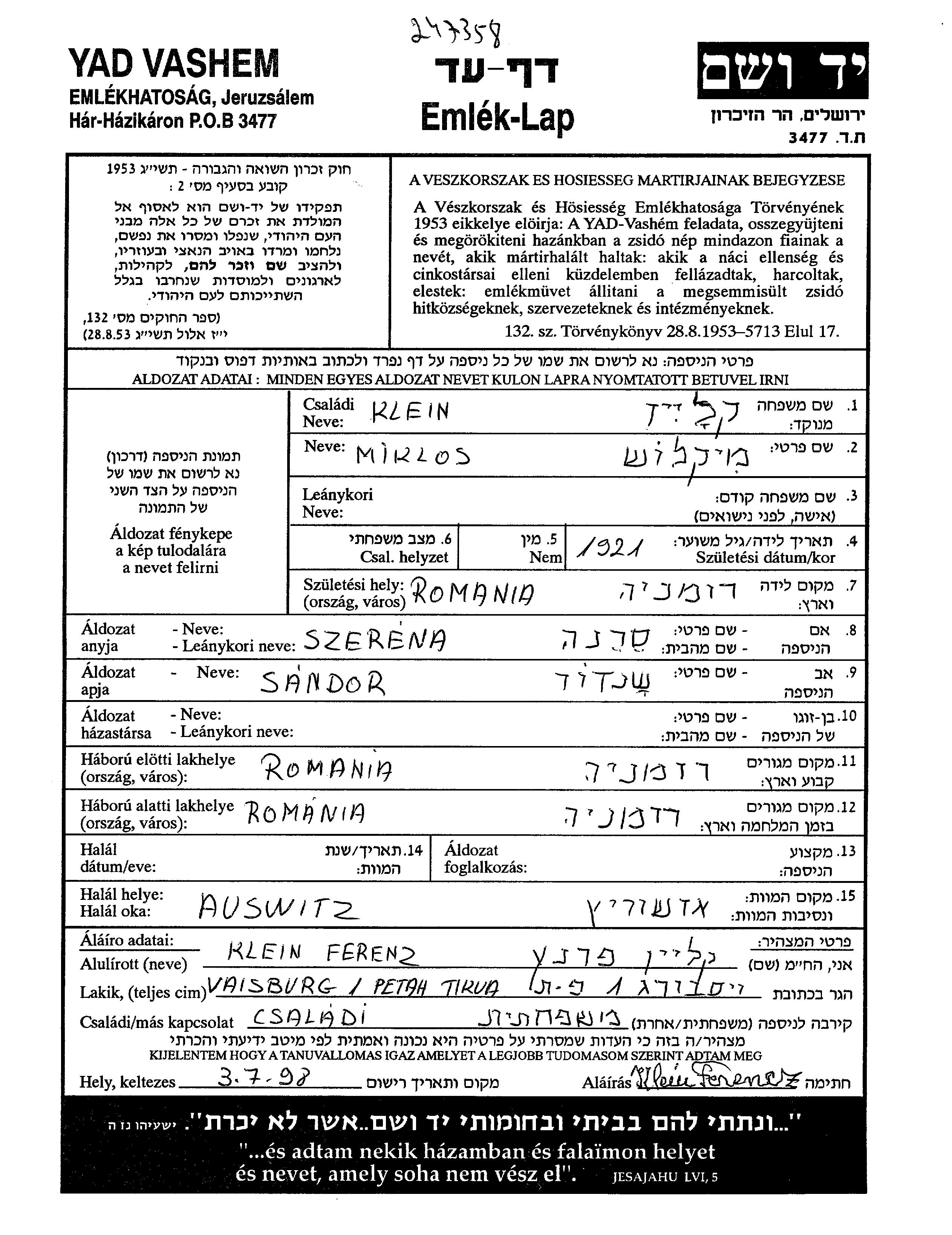 Miklos wurde in der Schoah ermordet. Todesort: Auschwitz, Polen.