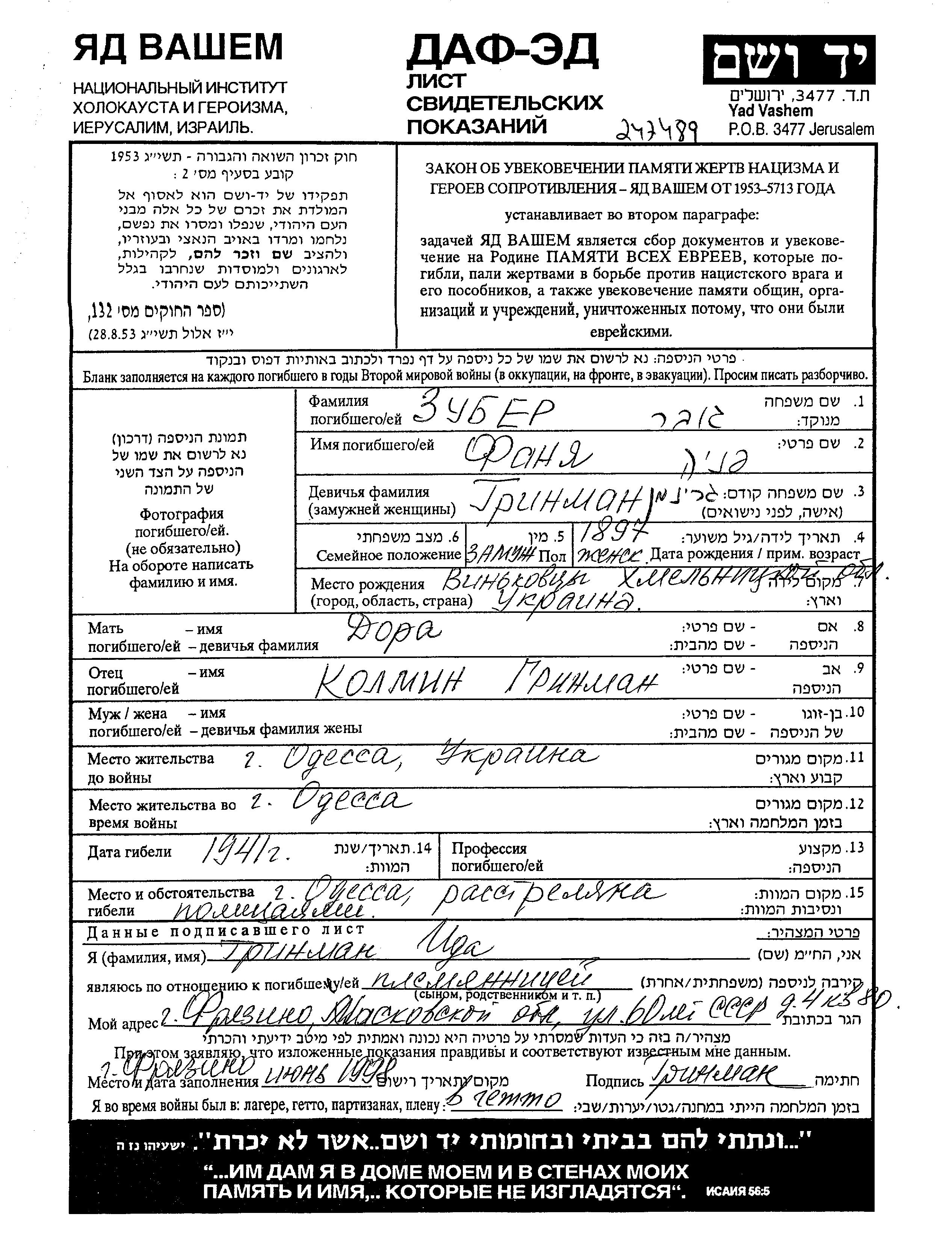 Fanya Zuber, geb. Grinman wurde im Jahr 1897 in Vinkovtsy, Ukraine (UdSSR) geboren. Sie war die Tochter von Kolmin und Dora. Sie war Verheiratet. Vor dem Zweiten Weltkrieg lebte sie in Odessa, Ukraine (UdSSR). Während des Krieges war sie in Odessa, Ukraine (UdSSR).