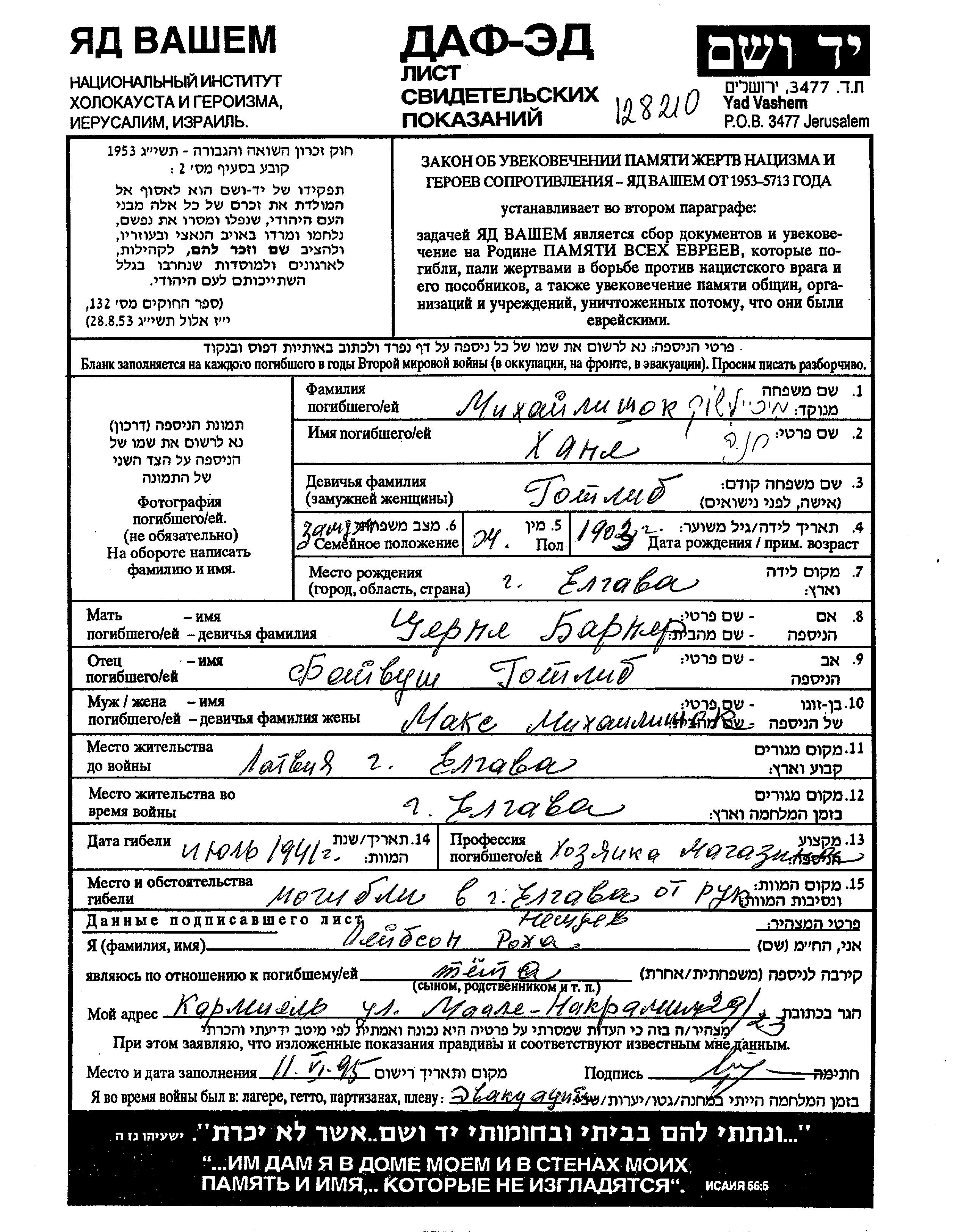 Khane Mikhailishok, geb. Gotlib wurde im Jahr 1903 in Jelgava, Lettland geboren. Sie war die Tochter von Faibush und Chernia, geb. Barner Brener. Sie war Kaufmann/-frau und mit Max Verheiratet. Vor dem Zweiten Weltkrieg lebte sie in Jelgava, Lettland. Während des Krieges war sie in Jelgava, Lettland.