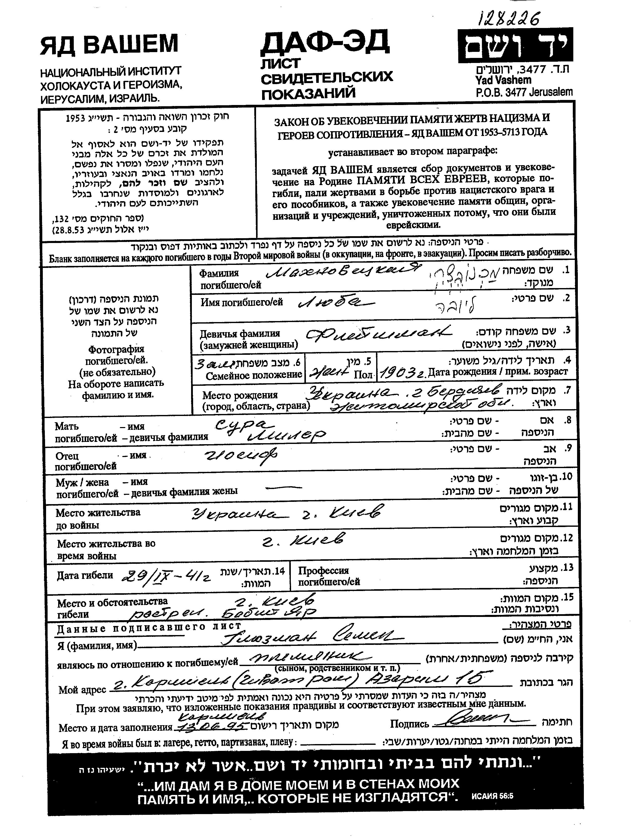 Liuba Makhnovetzkaya, geb. Fleyshman wurde im Jahr 1903 in Berdichev, Ukraine (UdSSR) geboren. Sie war die Tochter von Iosif und Sura, geb. Miler. Sie war Verheiratet. Vor dem Zweiten Weltkrieg lebte sie in Kiyev, Ukraine (UdSSR). Während des Krieges war sie in Kiyev, Ukraine (UdSSR).