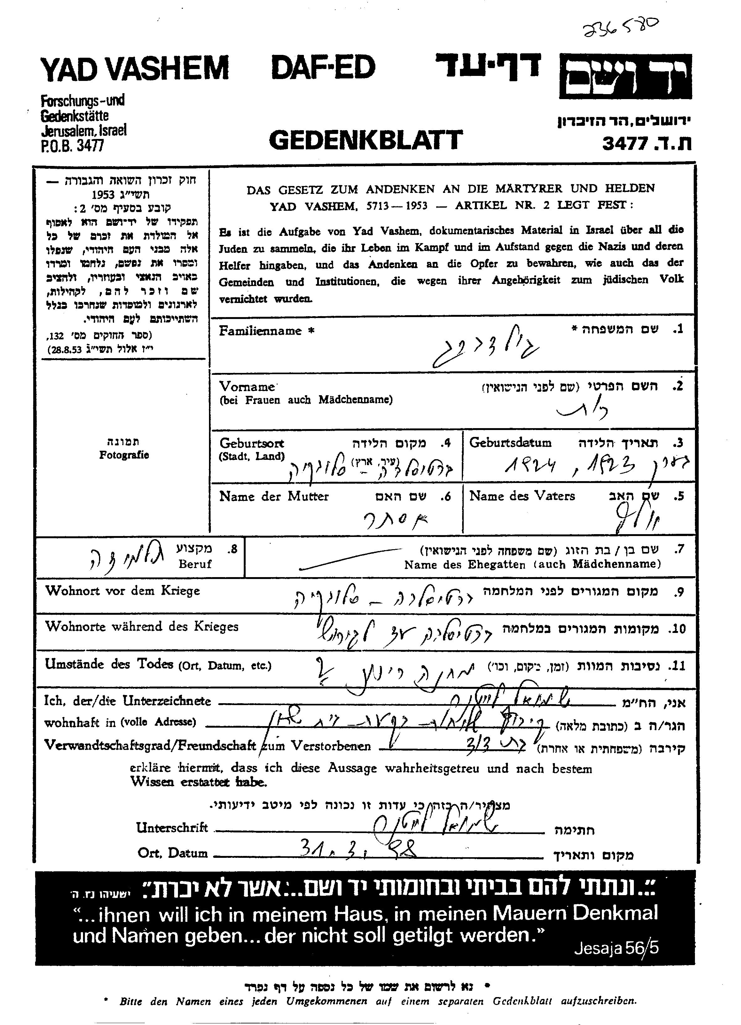 Yad Vashem - Gedenkblätter Sammlung