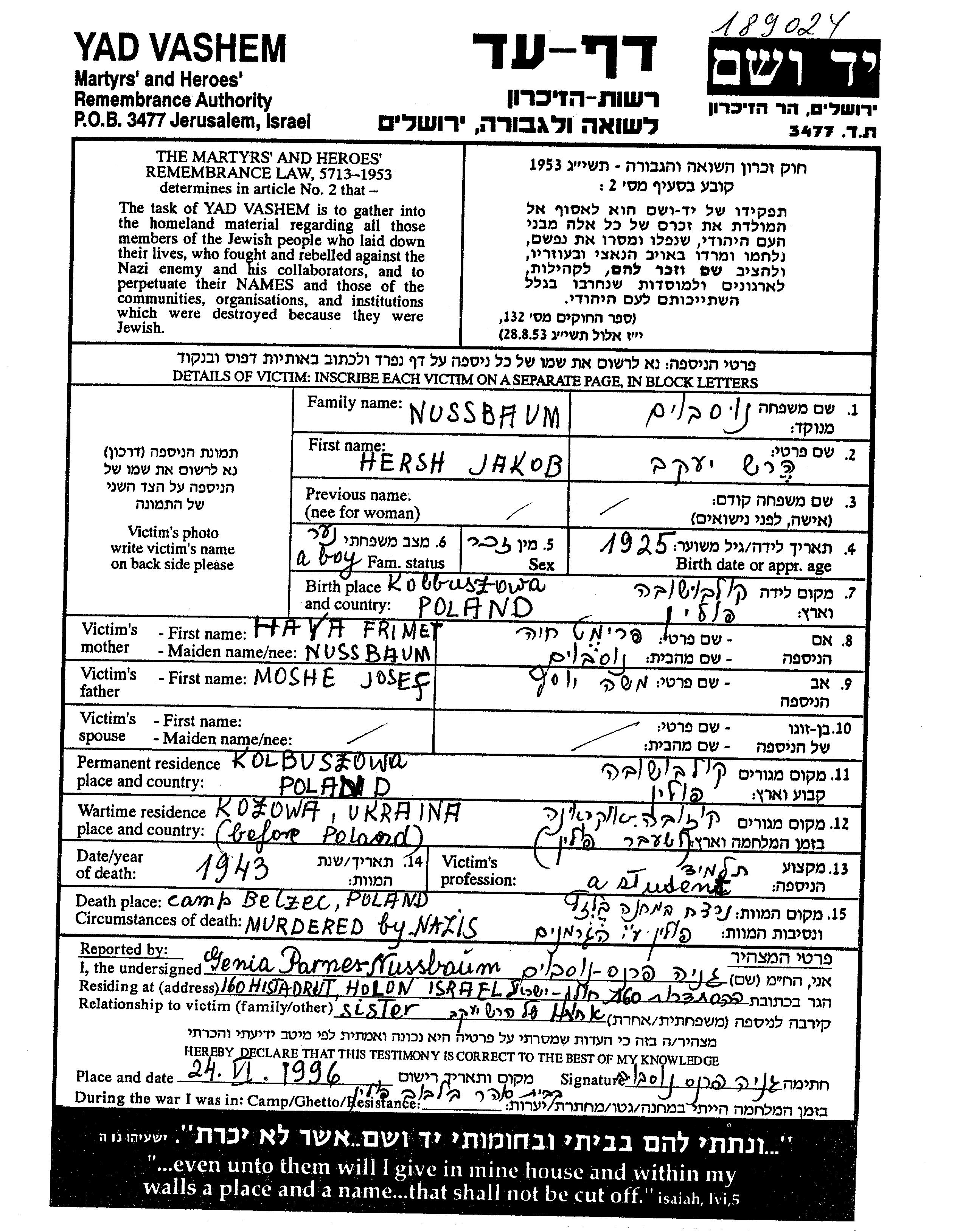 Hersh Jakob Nußbaum wurde im Jahr 1925 in Kolbuszowa, Polen geboren. Er war der Sohn von Moshe Josef und Haya Frimet, geb. Nußbaum. Er war Schüler/-in und Ledig. Vor dem Zweiten Weltkrieg lebte er in Kolbuszowa, Polen. Während des Krieges war er in Kozowa, Polen.