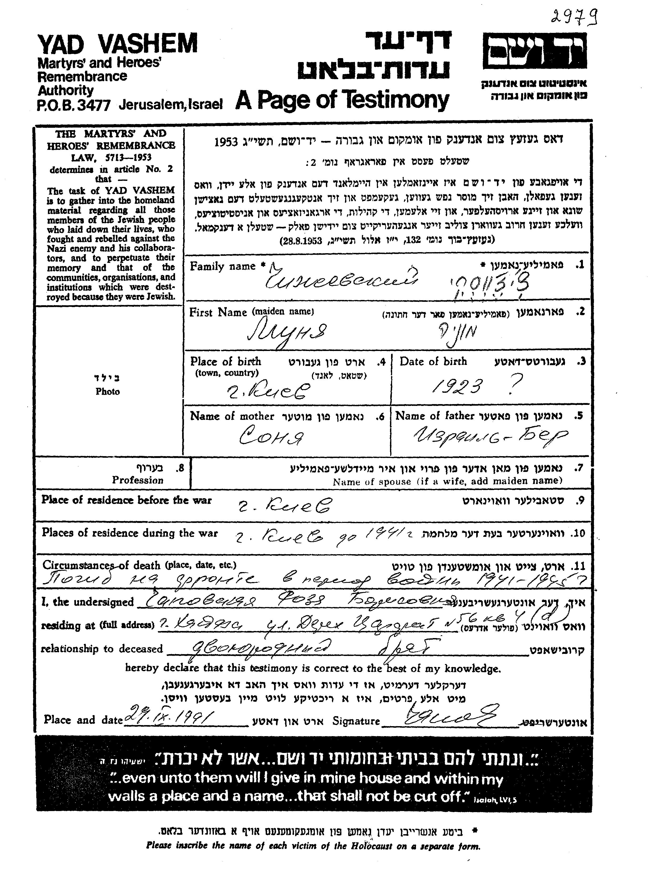 Munya Chizhevski wurde im Jahr 1923 in Kiyev, Ukraine (UdSSR) geboren. Er war der Sohn von Izrail Ber und Sonia. Vor dem Zweiten Weltkrieg lebte er in Kiyev, Ukraine (UdSSR). Während des Krieges war er in die Sowjetischen Streitkräfte. Munya im Militärdienst umgekommen.