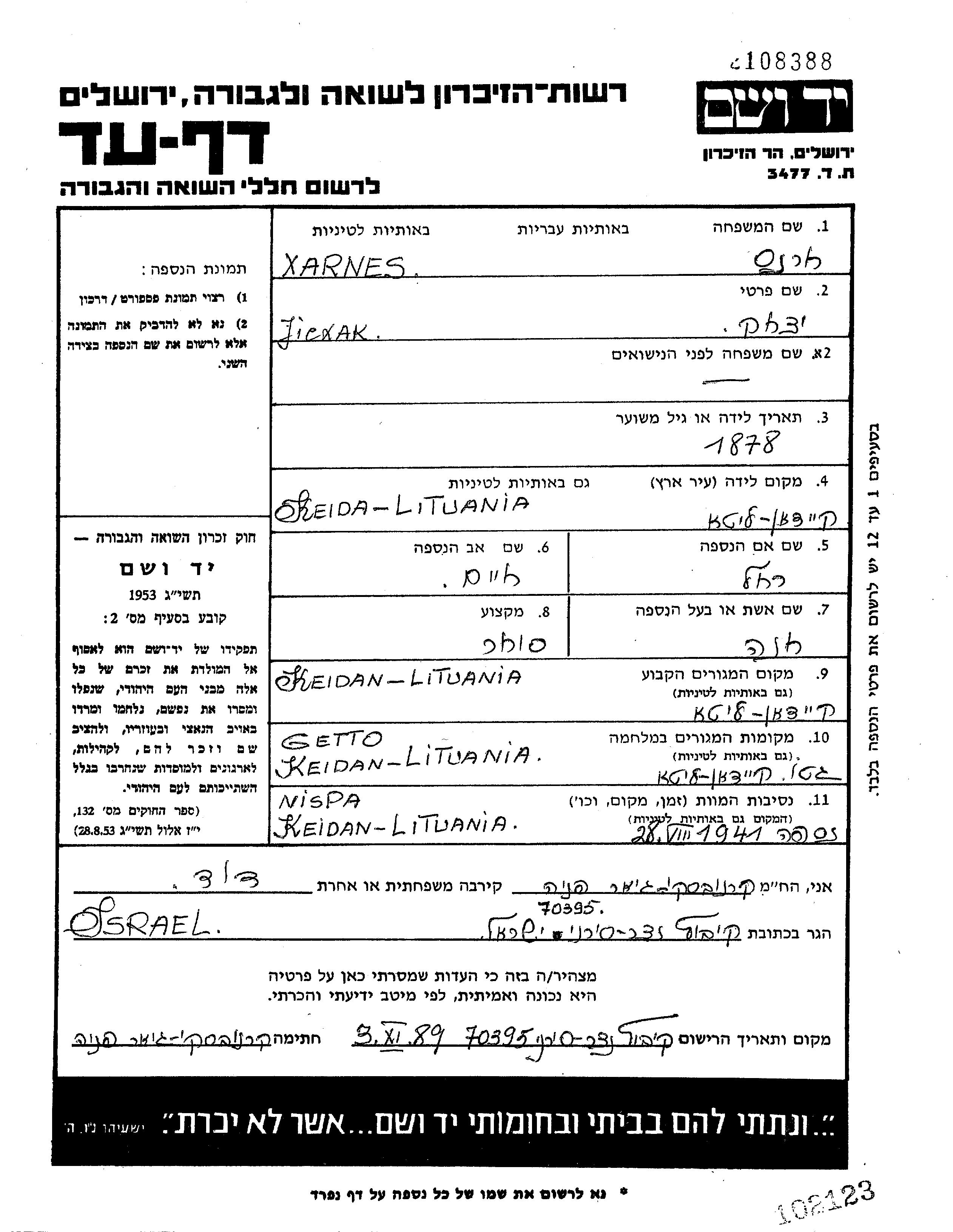 Jichak Kharnes wurde in Keidan, Litauen geboren. Er war der Sohn von Khaim und Rakhel. Er war Kaufmann/-frau und mit Xana Verheiratet. Vor dem Zweiten Weltkrieg lebte er in Keidan, Litauen. Während des Krieges war er in Keidan, Litauen.