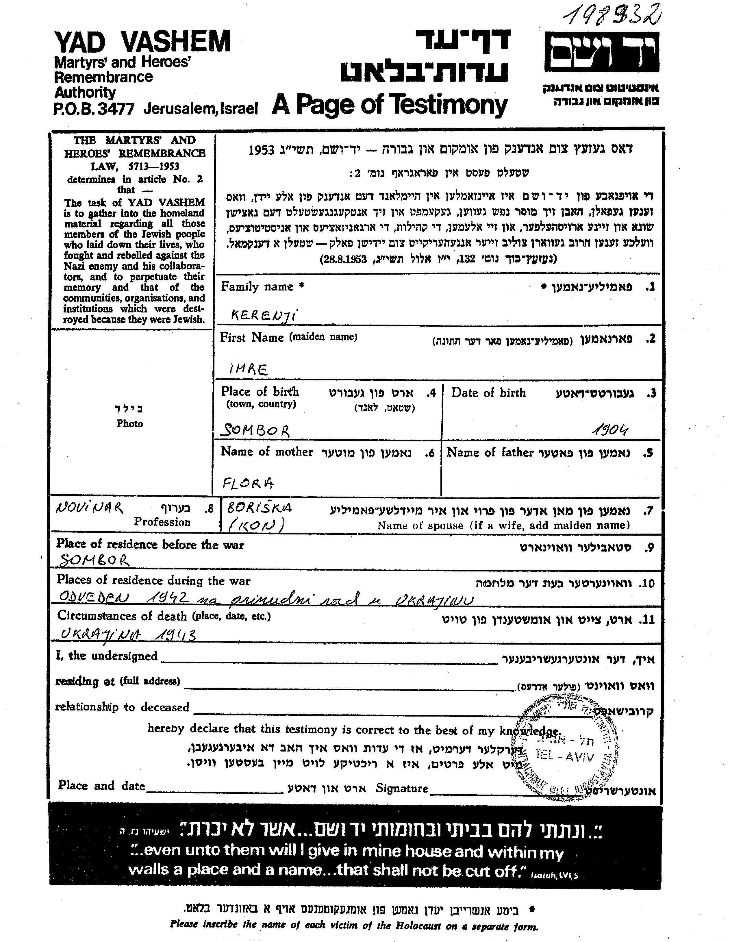 Imre Kerenji wurde im Jahr 1904 in Sombor, Jugoslawien geboren. Er war der Sohn von Flora. Vor dem Zweiten Weltkrieg lebte er in Sombor, Jugoslawien. Während des Krieges war er in Sombor, Jugoslawien.
