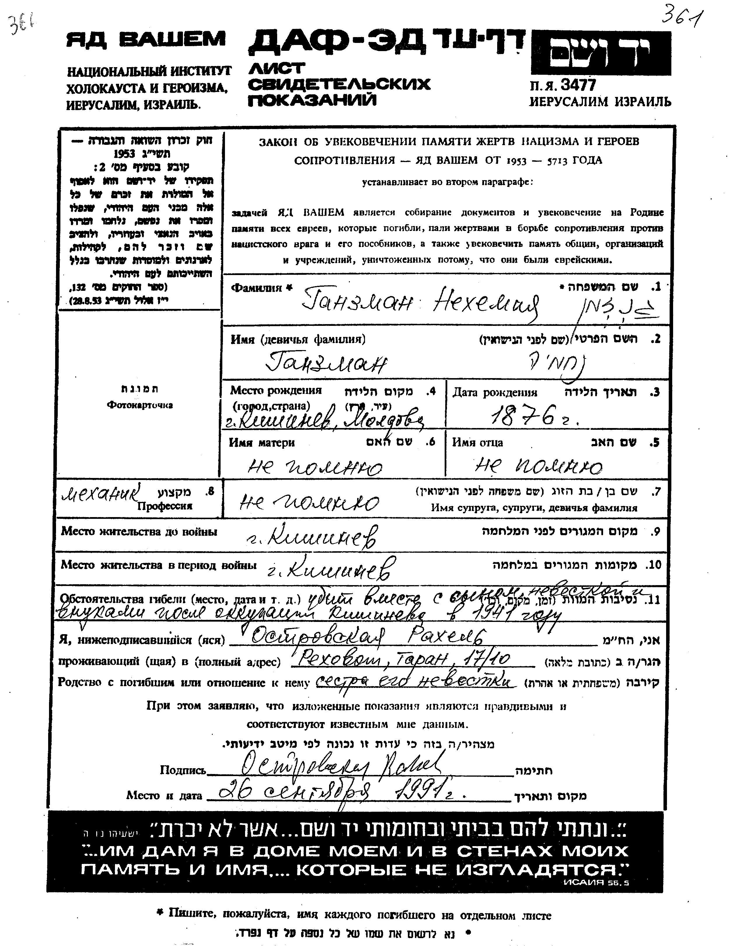 Nekhemiya wurde in der Schoah ermordet. Todesort: Chisinau, Rumänien im Jahr 1941.