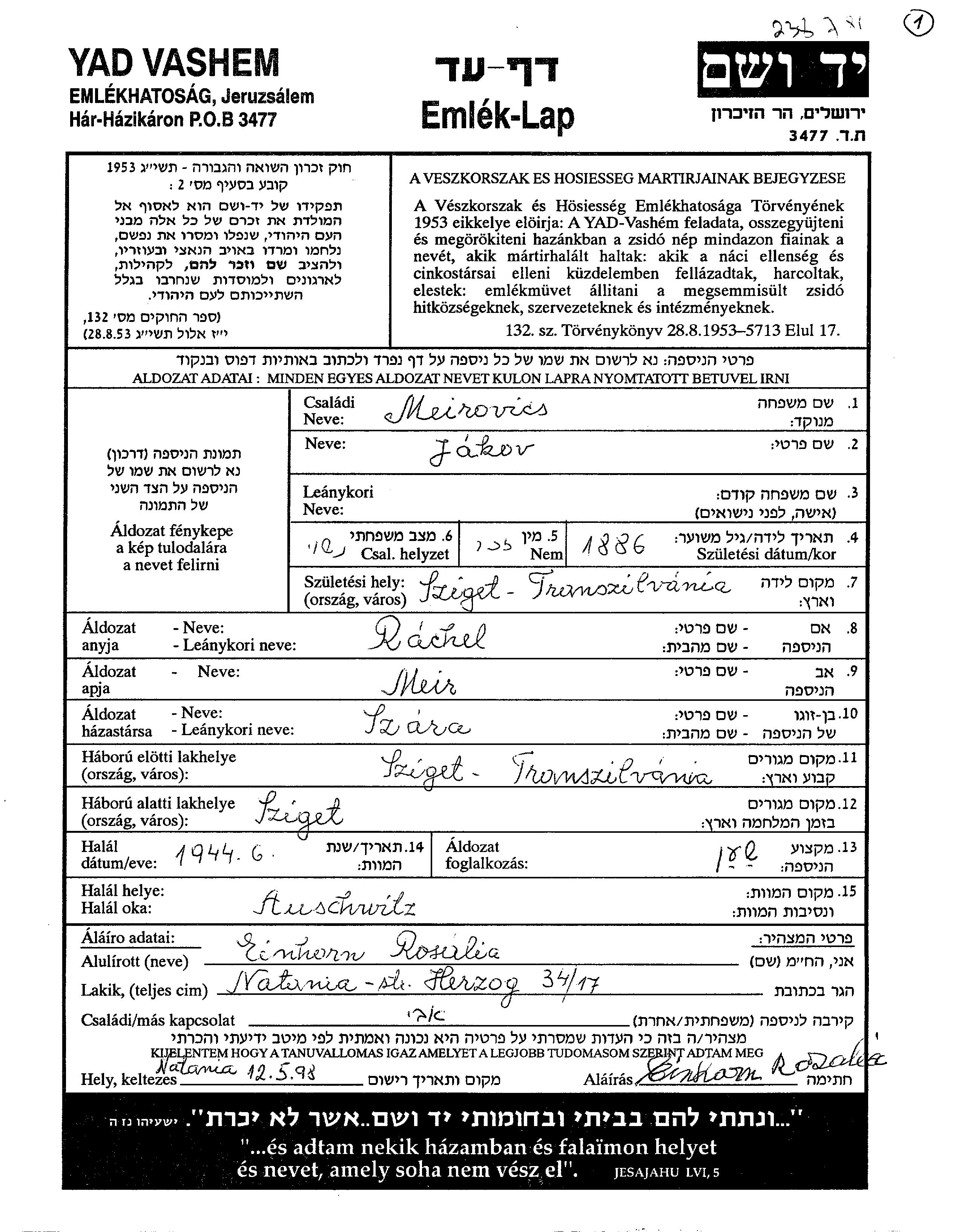 Jakov Meirovics wurde im Jahr 1886 in Sziget, Rumänien geboren. Er war der Sohn von Mair und Rachel. Er war Uhrmacher/-in und mit Szara Verheiratet. Vor dem Zweiten Weltkrieg lebte er in Sziget, Rumänien. Während des Krieges war er in Sziget, Rumänien.