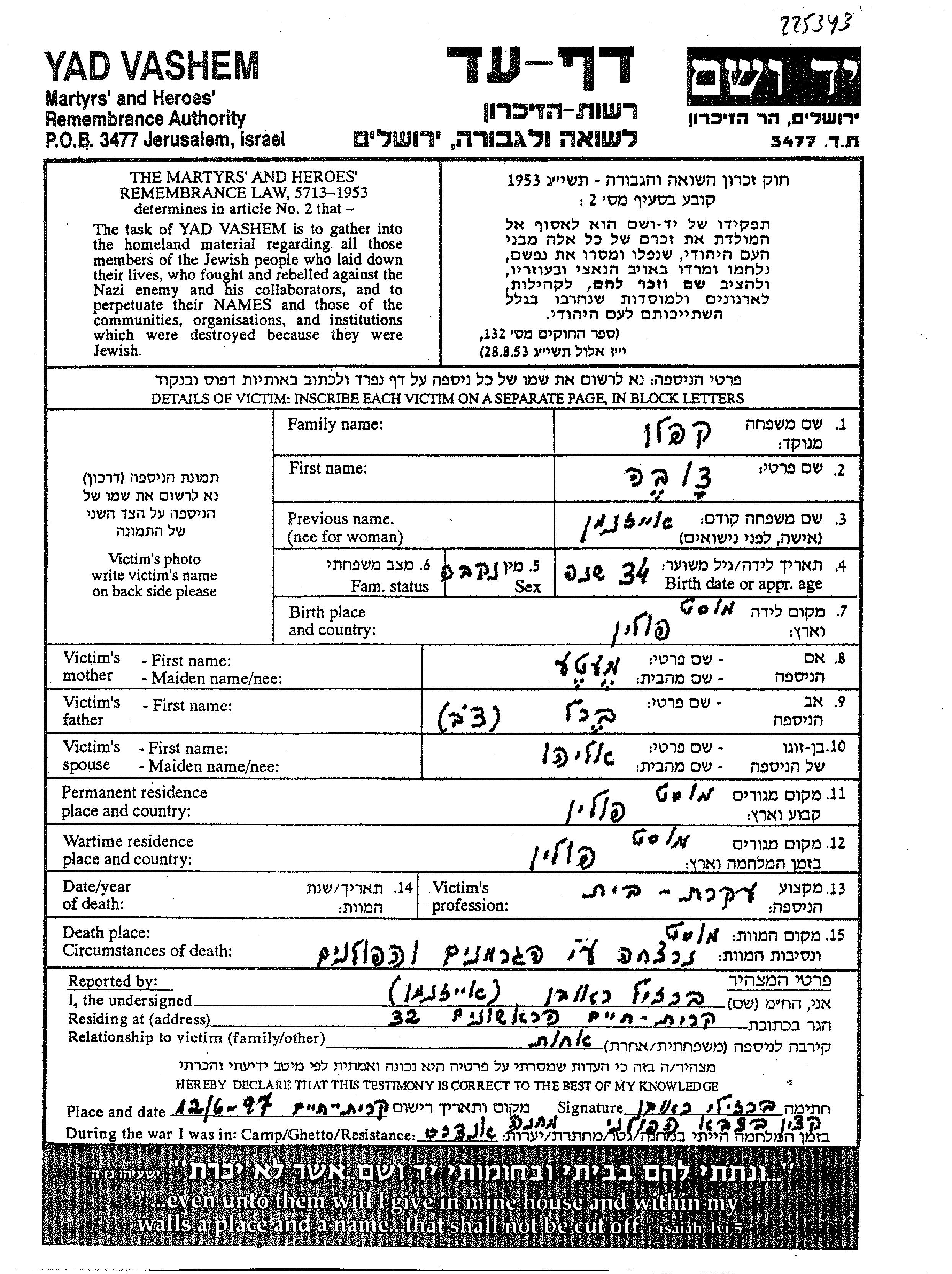 Doba Kaplan, geb. Aizenman wurde in Mosty, Polen geboren. Sie war die Tochter von Berl Tzvi und Mete Mate. Sie war Hausfrau und mit Eliyahu Verheiratet. Vor dem Zweiten Weltkrieg lebte sie in Mosty, Polen. Während des Krieges war sie in Mosty, Polen.