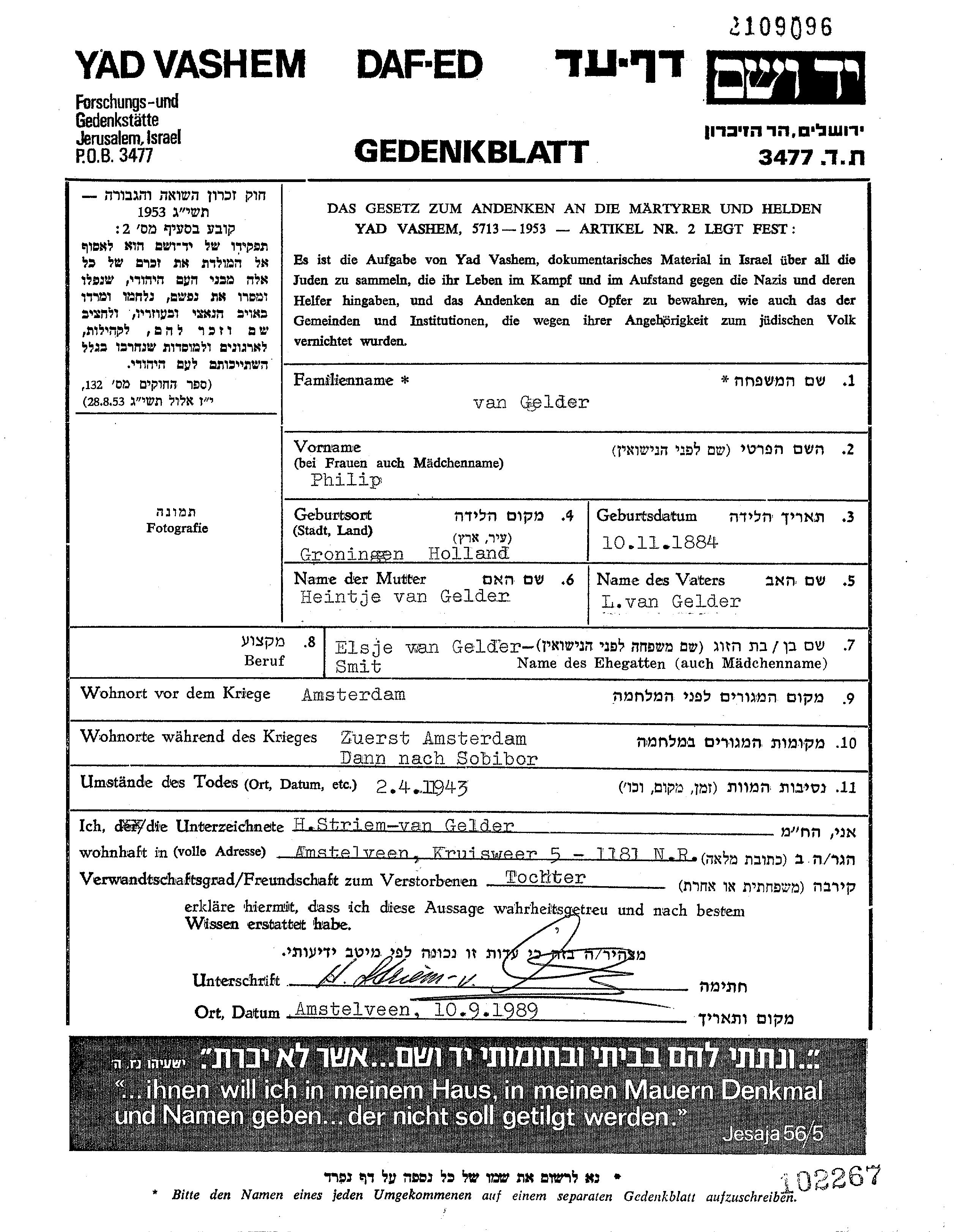 Gelder van Philip 1884 Groningen, Niederlande Liste von ermordeten Juden aus Holland