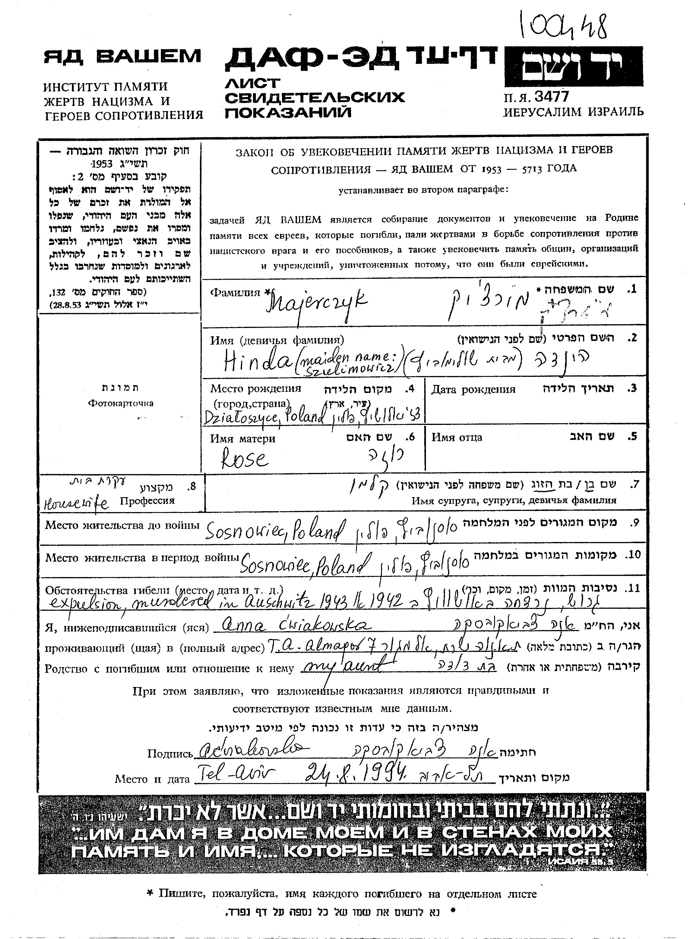 Majerczyk Hinda Sosnowiec, Polen Gedenkblatt