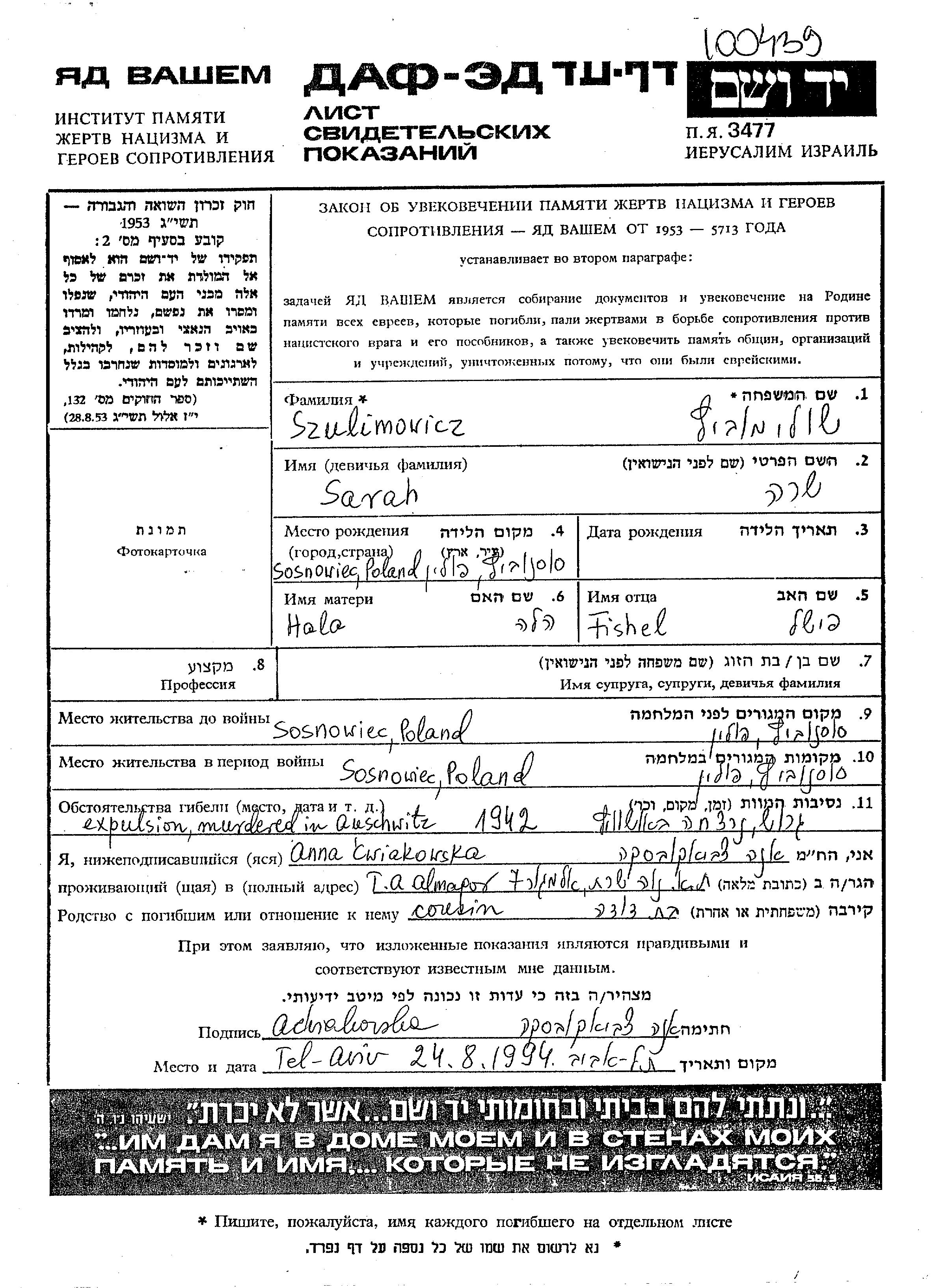 Sarah Szulimowicz wurde in Sosnowiec, Polen geboren. Sie war die Tochter von Fishel und Hala Hela, geb. Name unbekannt. Sie war Ledig. Vor dem Zweiten Weltkrieg lebte sie in Sosnowiec, Polen. Während des Krieges war sie in Sosnowiec, Polen.