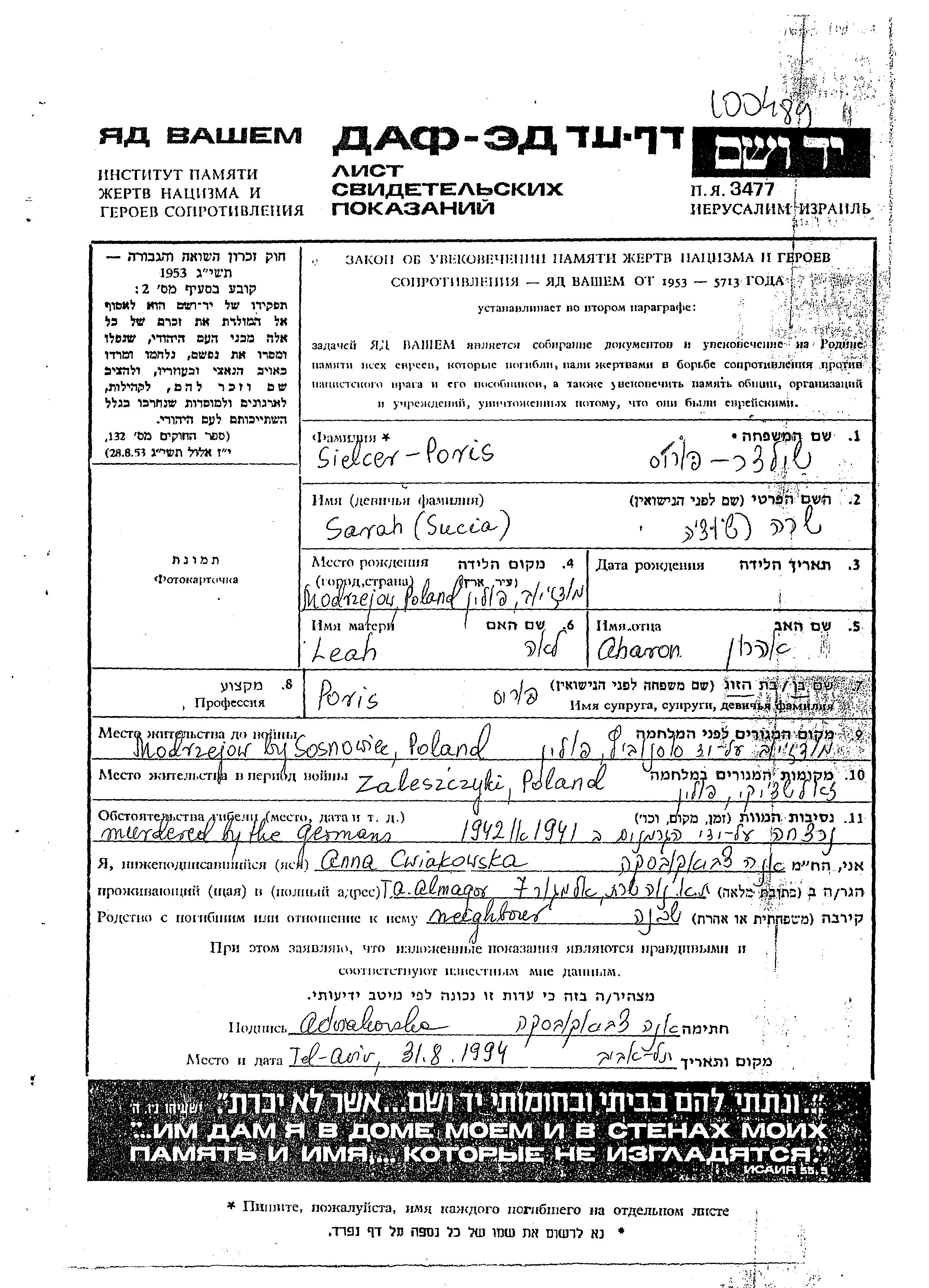 Sarah Sucia Batsheva Poris Puris, geb. Sielcer Shiltzer wurde in Modrzejow, Polen geboren. Sie war die Tochter von Aharon und Leah, geb. Name unbekannt. Sie war Verheiratet. Vor dem Zweiten Weltkrieg lebte sie in Modrzejow, Polen. Während des Krieges war sie in Zaleszczyki, Polen.