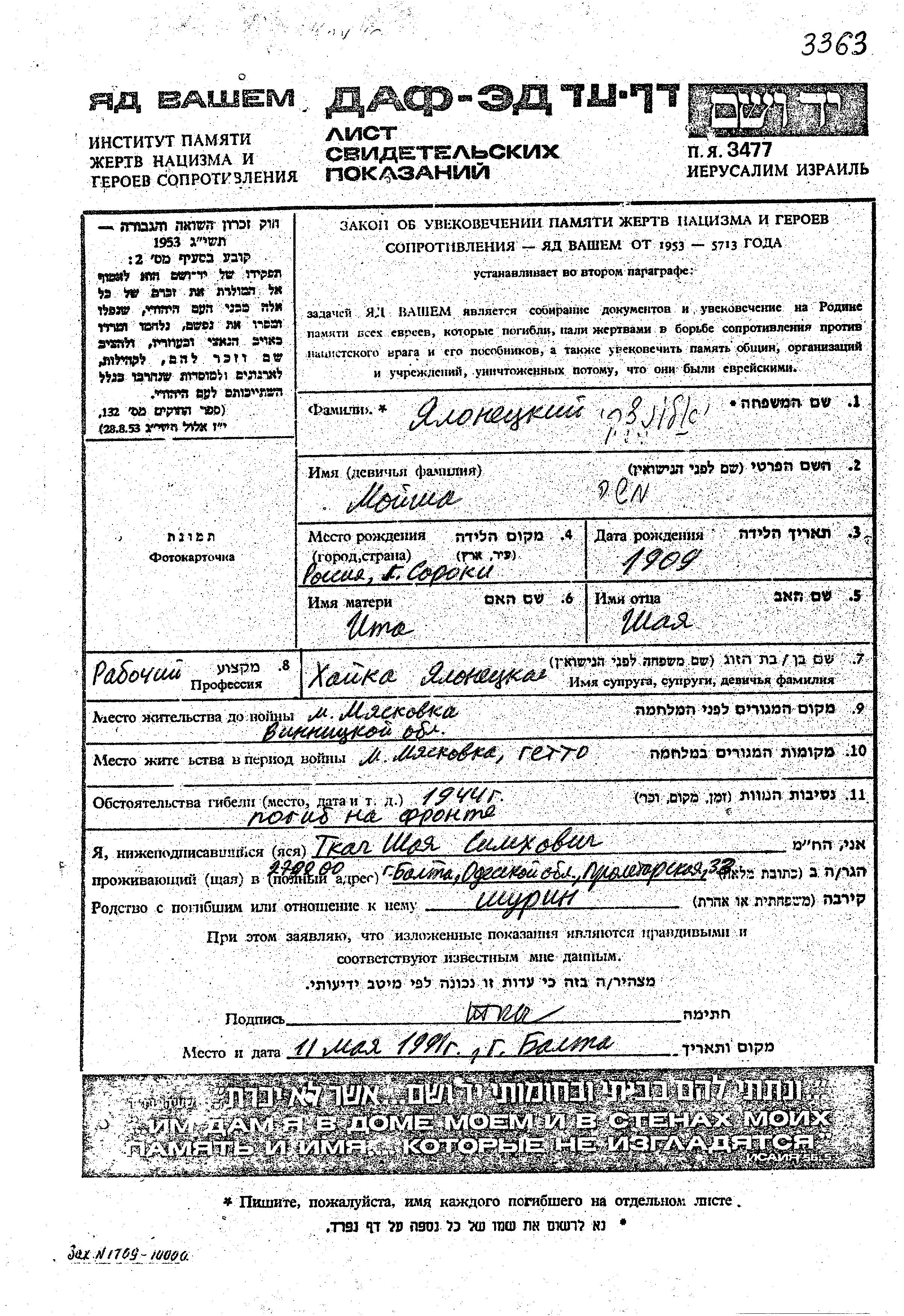 Moisha Yalonetzki wurde im Jahr 1909 in Soroca, Rumänien geboren. Er war der Sohn von Shaya Sheya und Ita. Er war Arbeiter/-in und mit Khaika Verheiratet. Vor dem Zweiten Weltkrieg lebte er in Myaskovka, Ukraine (UdSSR). Während des Krieges war er in Myaskovka, Ukraine (UdSSR).
