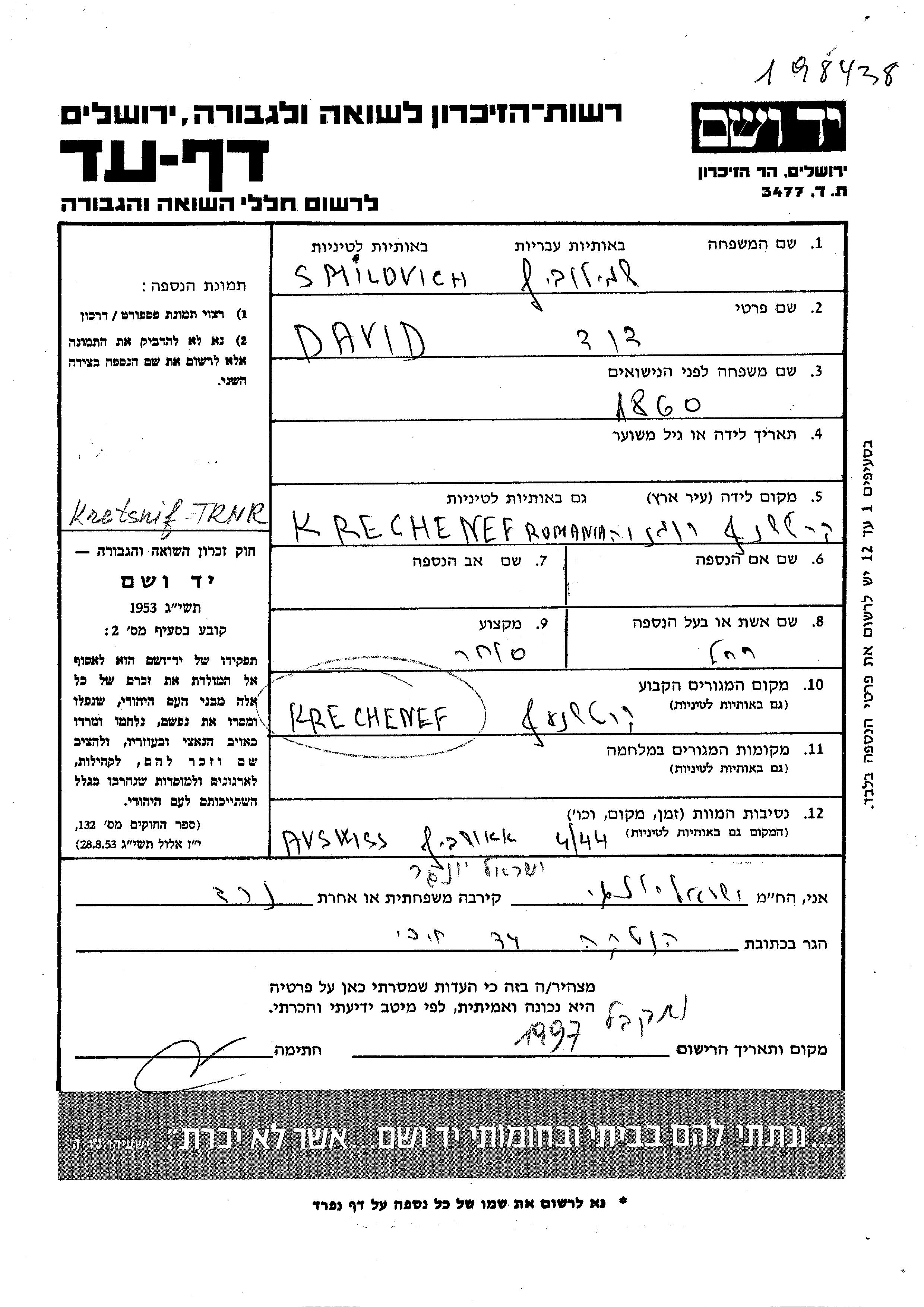 David Smilovich wurde im Jahr 1860 in Kretsnif, Rumänien geboren. Er war Kaufmann/-frau und mit Rakhel Verheiratet. Vor dem Zweiten Weltkrieg lebte er in Kretsnif, Rumänien. Während des Krieges war er in Kretsnif, Rumänien.