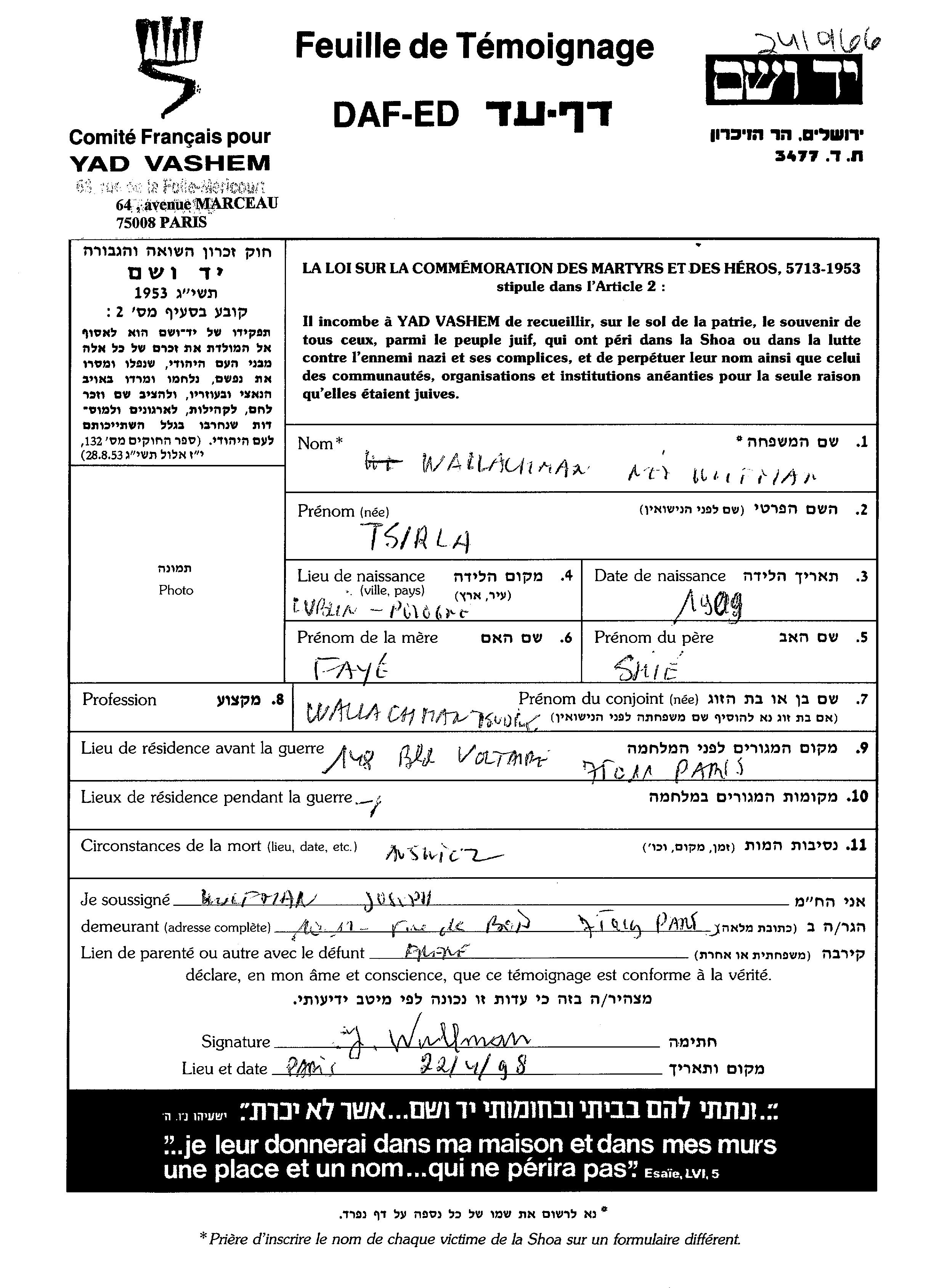 Tsirla Wallachman, geb. Wulfman wurde im Jahr 1909 in Lublin, Polen geboren. Sie war die Tochter von Shie Shaia und Faye Paia. Sie war mit Tsudik Verheiratet. Vor dem Zweiten Weltkrieg lebte sie in Paris, Frankreich. Während des Krieges war sie in Paris, Frankreich.