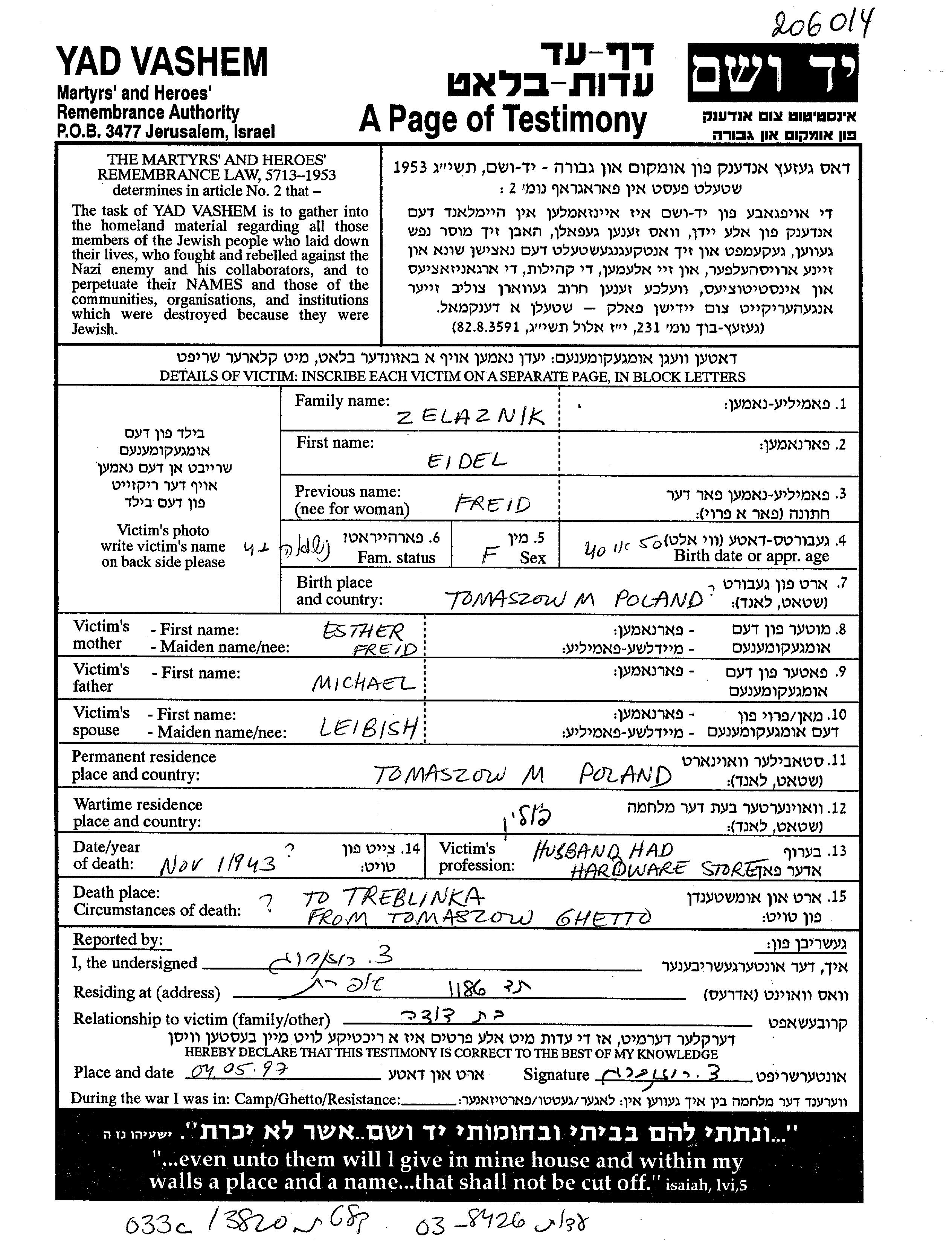 Eidel Zelaznik, geb. Freid wurde in Tomaszow Mazowiecki, Polen geboren. Sie war die Tochter von Michael und Esther, geb. Freid. Sie war mit Leibish Verheiratet. Vor dem Zweiten Weltkrieg lebte sie in Tomaszow Mazowiecki, Polen. Während des Krieges war sie in Tomaszow Mazowiecki, Polen.
