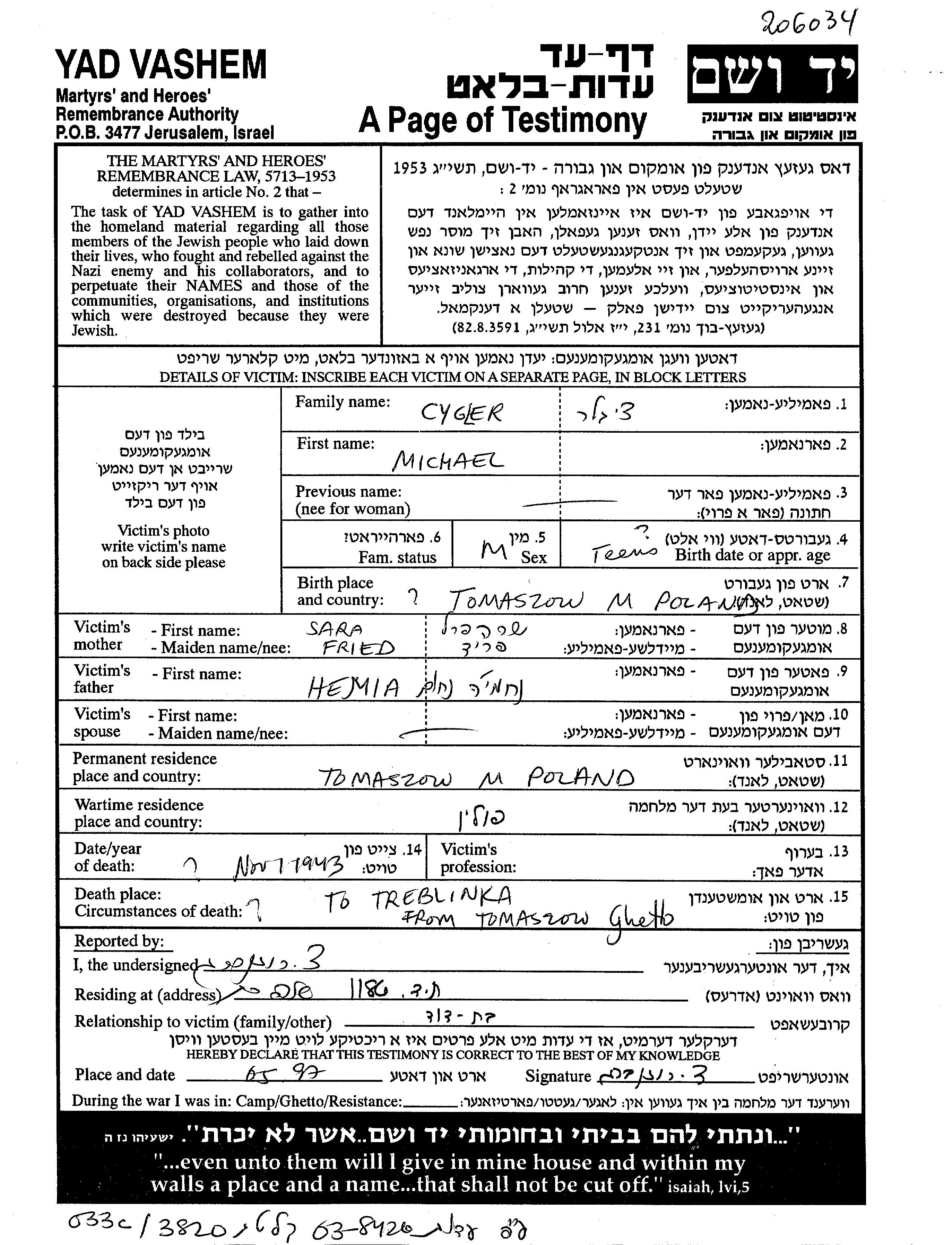 Cygler Michael Tomaszow Mazowiecki, Polen Gedenkblatt
