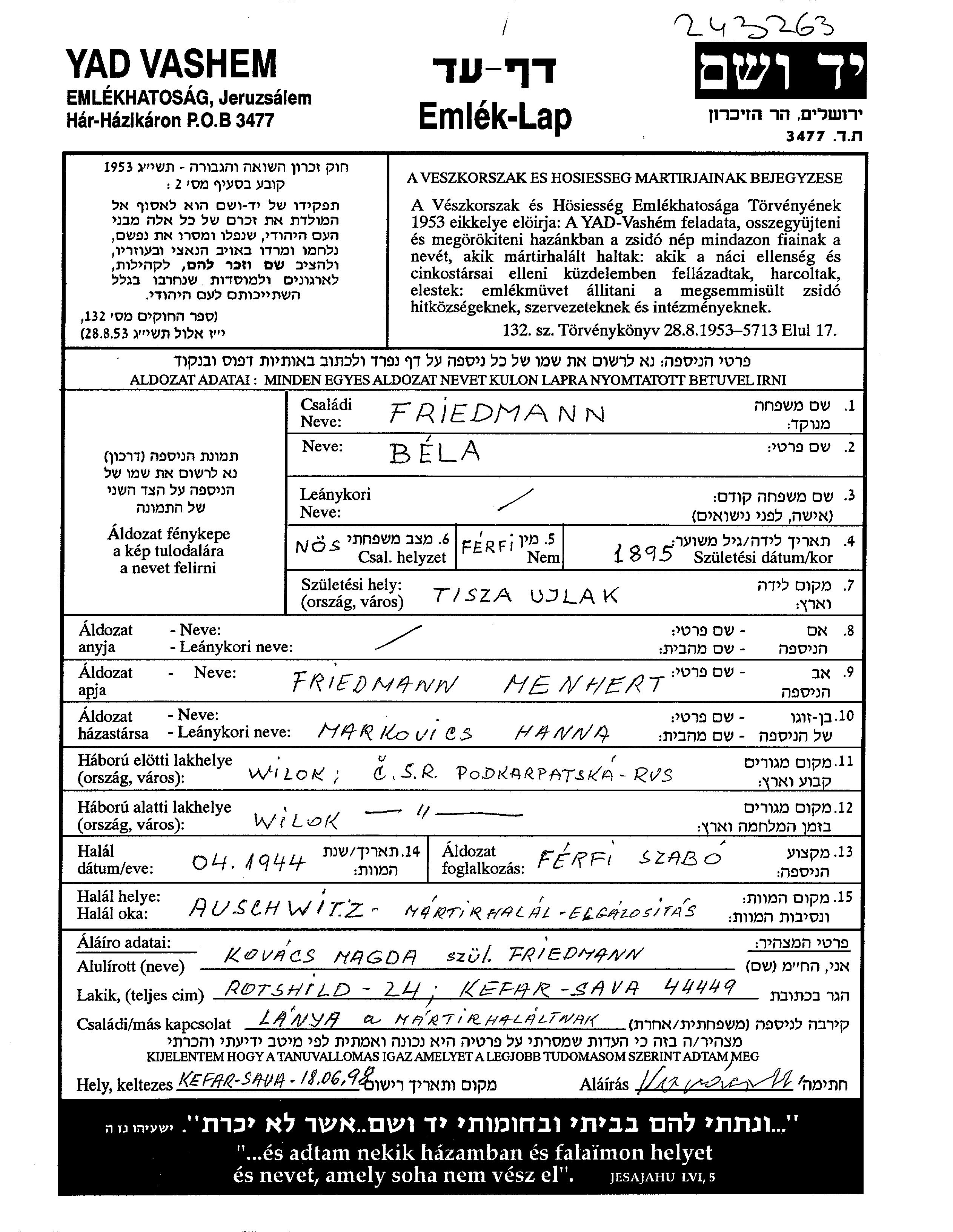 Bela Friedmann wurde im Jahr 1895 in Vylok, Tschechoslowakei geboren. Er war der Sohn von Menhert. Er war Schneider und mit Hanna Verheiratet. Vor dem Zweiten Weltkrieg lebte er in Vylok, Tschechoslowakei. Während des Krieges war er in Vylok, Tschechoslowakei.