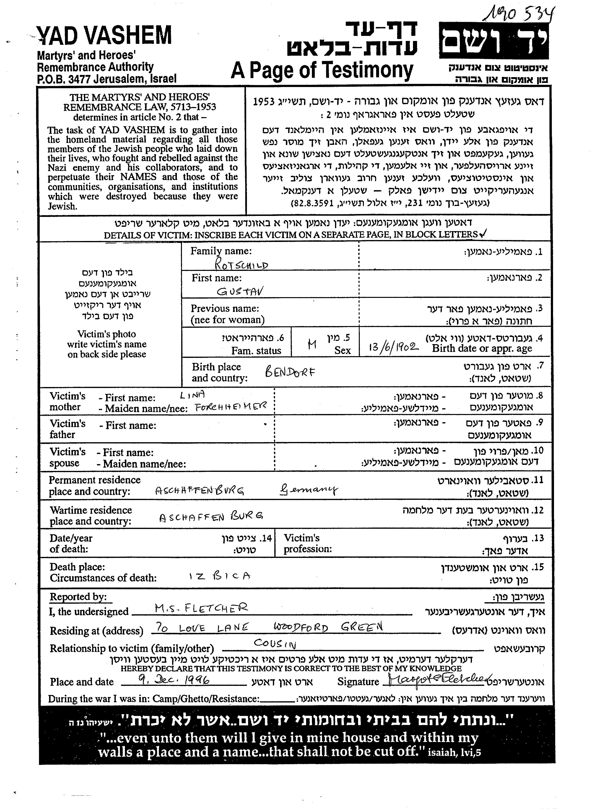 Gustav Rotschild wurde im Jahr 1902 in Bendorf, Deutsches Reich geboren. Er war der Sohn von Shmuel und Lina, geb. Forchheimer. Er war Ledig. Vor dem Zweiten Weltkrieg lebte er in Aschaffenburg, Deutsches Reich. Während des Krieges war er in Aschaffenburg, Deutsches Reich.