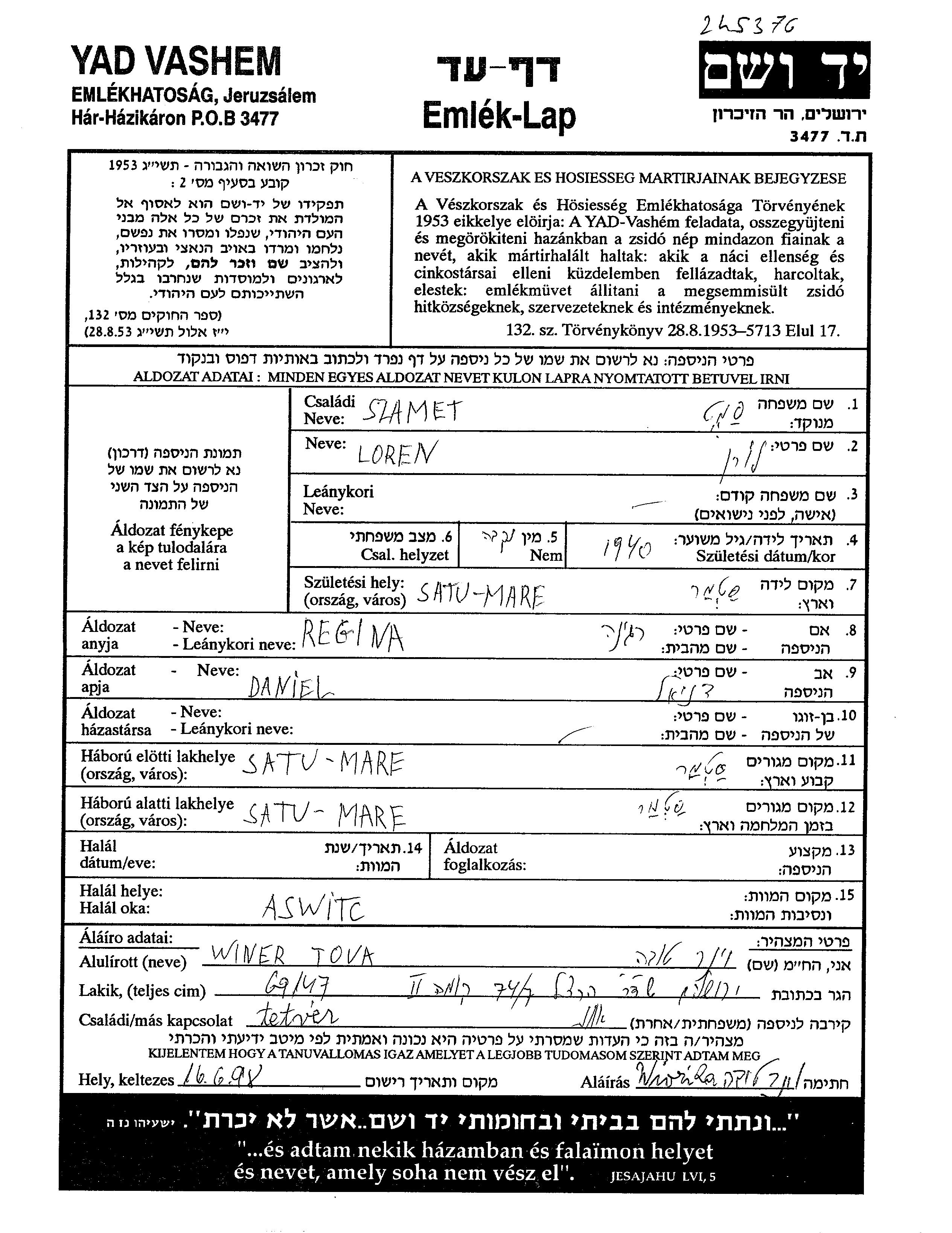 Loren Szamet wurde im Jahr 1940 in Satu Mare, Rumänien geboren. Sie war die Tochter von Daniel und Regina, geb. Izsak. Sie war Kind. Während des Krieges war sie in Satu Mare, Rumänien.